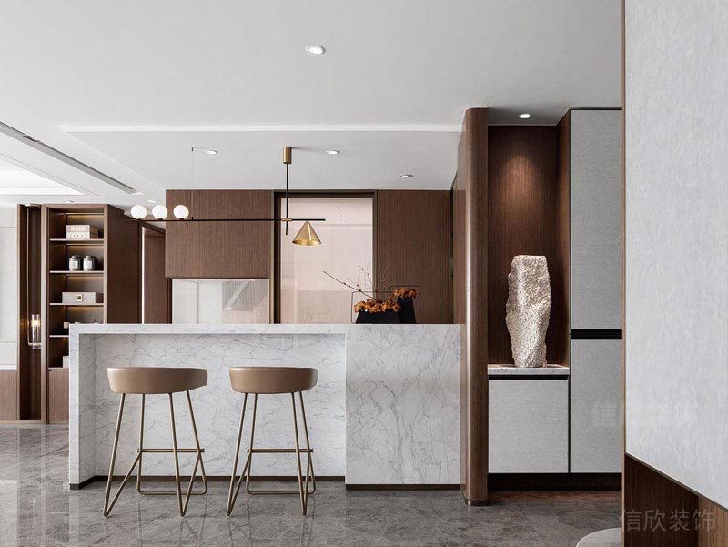 堂廳的結(jié)構(gòu)寬敞明亮,以東方傳統(tǒng)審美取向的中正布局為主,用大量的豎直線條和錯落的水平層面,使室內(nèi)空間別具一格。浩浩陽光,歲月靜好,都蘊藏在這廳堂之中。這種既包含有東方神韻又符合現(xiàn)代人的審美,便是新中式獨有的氣質(zhì)。