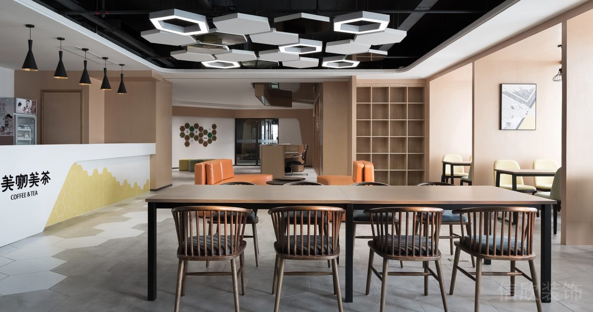 采用圓弧裝飾而成的天花板,通過(guò)寬大的圓形的吊燈,在青藍(lán)色的背景下,突出辦公室室內(nèi)的個(gè)性化與科技感