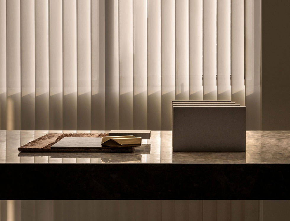 樣的,豎向條窗突破了墻面的連續(xù)感,與橫向臺面錯綜,相輔相成。透過隱秘的角落,能一窺室內(nèi)架上的雕塑,給人一種設計美感上的期許。