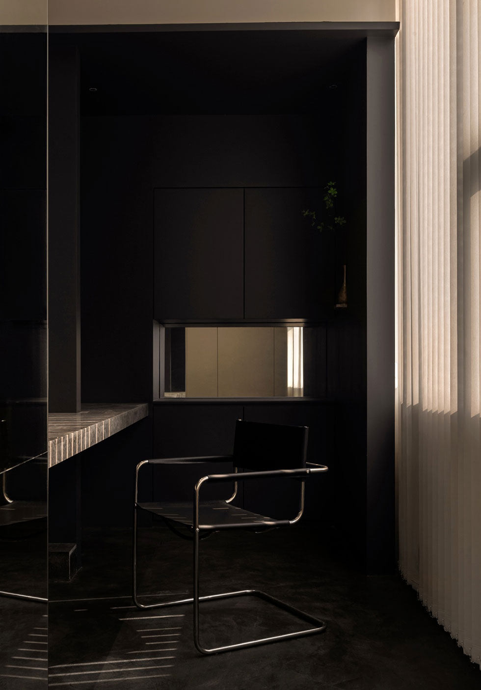 在精巧的小空間中構(gòu)置一方天地,需要一種縱橫交錯的構(gòu)成設計。不銹鋼板以橫向構(gòu)造臺面,垂直的軸線上,布置了專屬的玻璃盆景架,燈具如毛筆豎畫的懸針垂露,在墻面上勾出立體的空間。