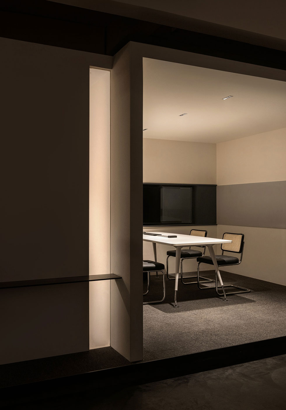 在適當?shù)奈恢瞄_口引光入室,配合人造的光源,在地面上留下點點微光層層遞進,頂上燈條在幽暗中破開一條光亮縫隙,引導前行。