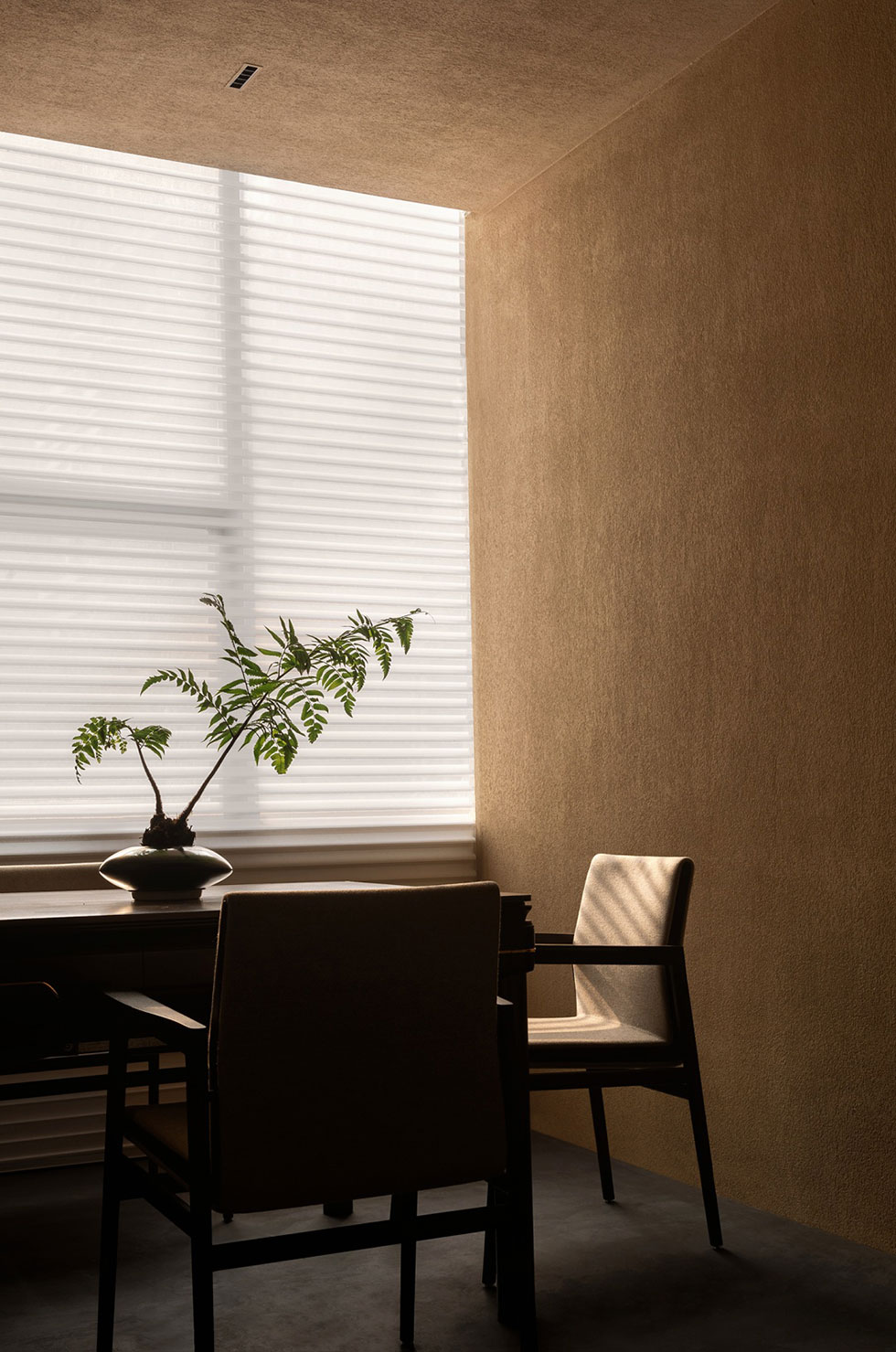 入口幽深,在相對「抑」的氛圍中,屏蔽掉城市喧囂的浮躁。橫向帶窗似隔又透,透露了后續(xù)的內(nèi)部空間,引人入勝。