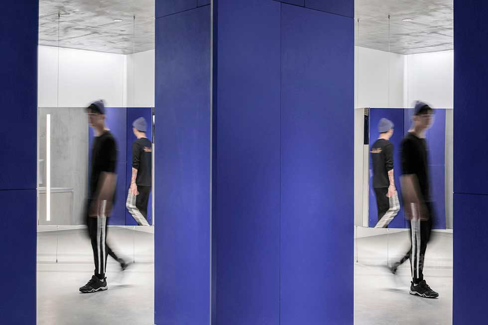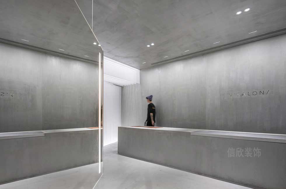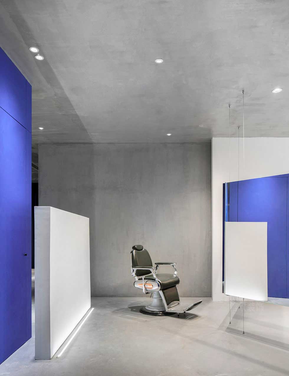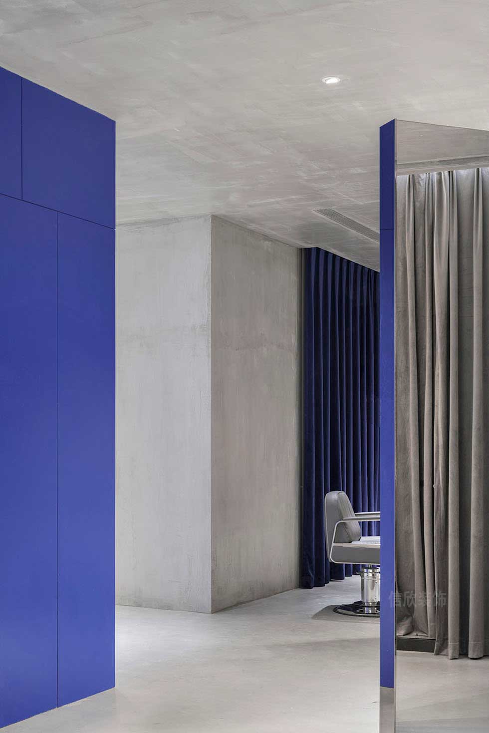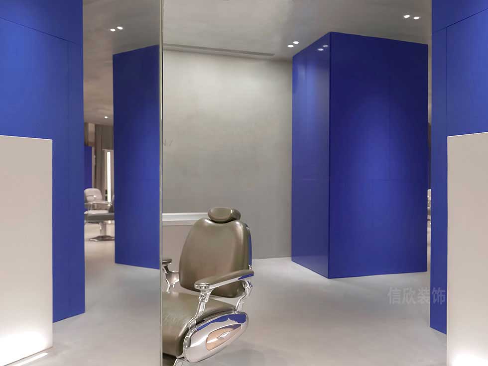 設計理念:這是一個在商場原安全通道基礎上改造的理發(fā)店。從設計到施工結(jié)束的周期大概一個月的時間,時間很短,限制很多,要求很多。不能有任何的固定隔墻,所有空間中可見的墻體都是臨時的必須可移動的。包括吧臺,鏡面,柜體都是可移動的。在有限的面積里,需要滿足員工休息區(qū),洗頭區(qū),vip護理區(qū),雜物收納間,等待區(qū),不少于12個的理發(fā)位,和足夠的收納等等。設計以塊面的穿插,鏡面的反射來趣味整個空間,藍色作為對比和跳躍,在灰白的空間中去做出打破。