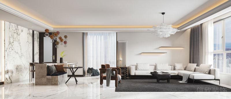 沙發(fā)背景墻選擇留白,這樣可以為屋主擺放一些自己的收藏品創(chuàng)造了空間。餐廳區(qū)域原本狹小單調(diào),在這面墻用了一塊大理石來(lái)裝飾墻面,和燈光的搭配下,會(huì)讓你感覺(jué)這里很有深意。