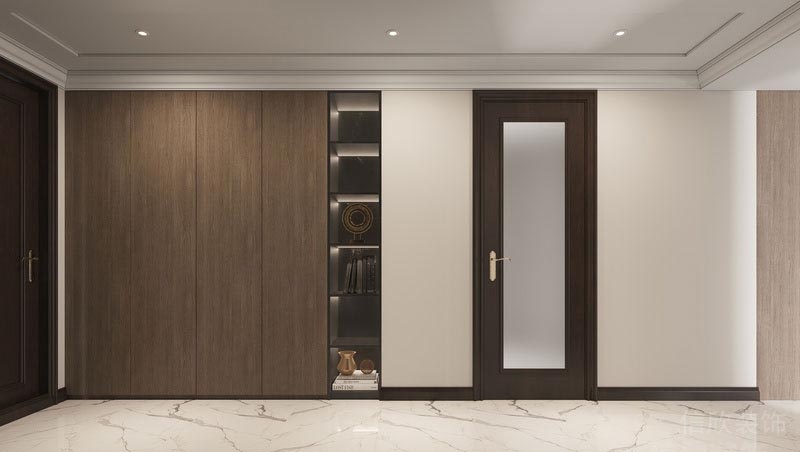 從客廳進(jìn)入到臥室需要經(jīng)過(guò)一個(gè)狹長(zhǎng)的過(guò)道,這個(gè)區(qū)域剛好有一個(gè)方儲(chǔ)物柜的位置,為了避免單調(diào)和封閉,柜子做了半開(kāi)放和發(fā)光,這樣這里還可以擺放物件,增加趣味。