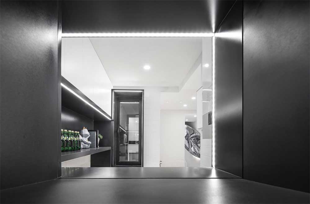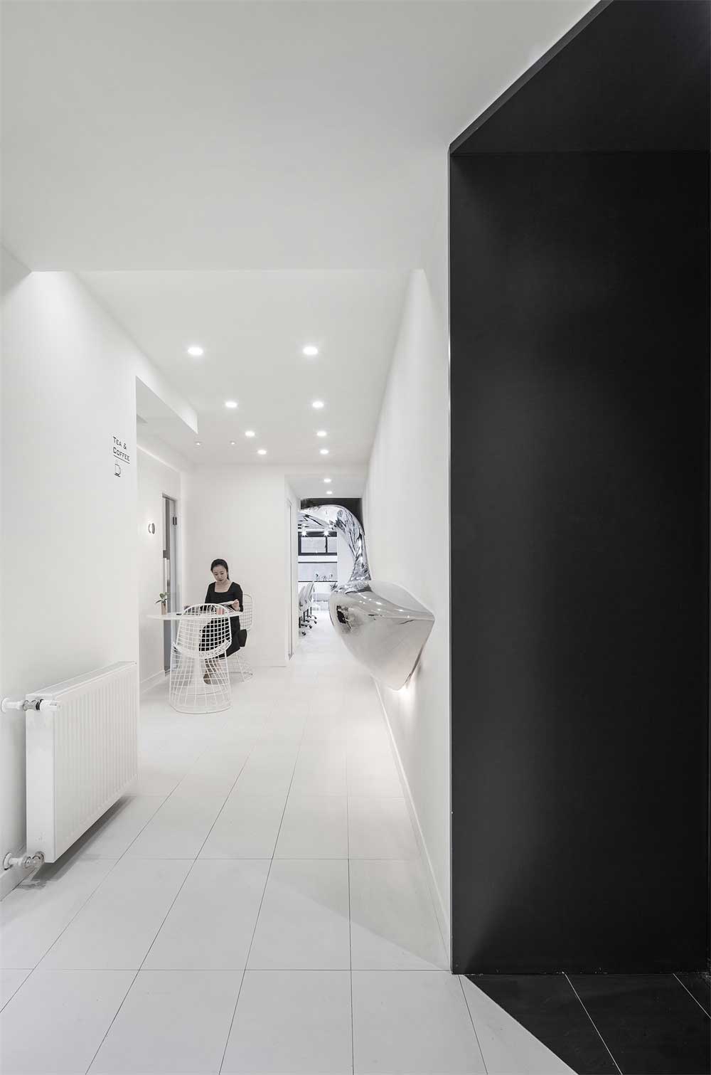 設(shè)計(jì)工作室進(jìn)門,設(shè)有黑色色系的咖啡區(qū),白色手工鐵藝的小接待區(qū)。