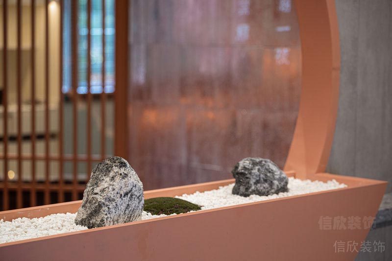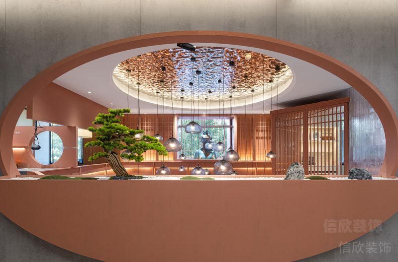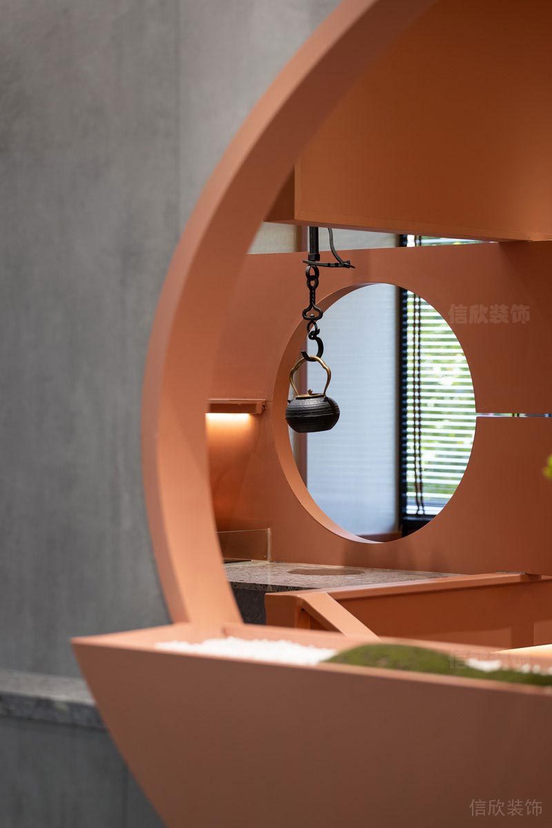 墻面上開了圓孔的隔墻,暗合天圓地方之意,開闊了視野,可以把陽光引進來,枯山水的綠植用餐之余,也是一道養(yǎng)眼的綠意。