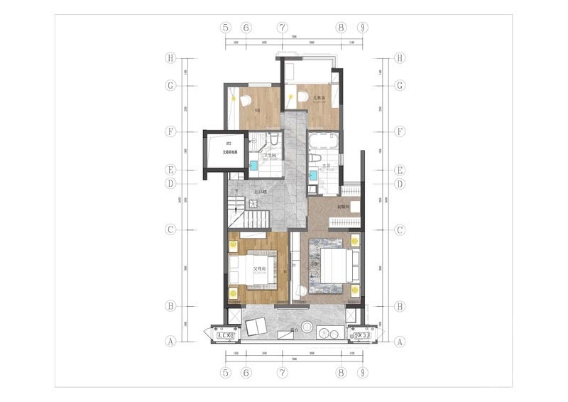 硬包床頭背景墻,現(xiàn)代的布藝床,木紋的護墻板,塑造出溫馨的主臥