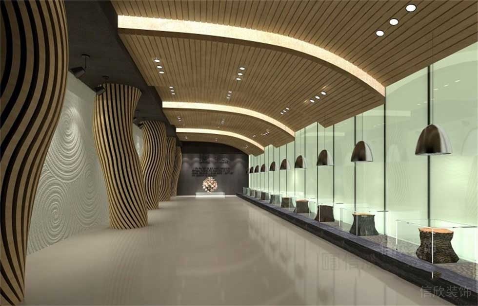 木文化長(zhǎng)廊裝修設(shè)計(jì),原木風(fēng)格的格柵頂,砂巖的墻面,螺旋形狀的柱子等元素,讓通透式 的長(zhǎng)廊顯得藝術(shù)感強(qiáng)烈,美感十足,現(xiàn)代玻璃的展區(qū)襯托的惟妙惟肖。
