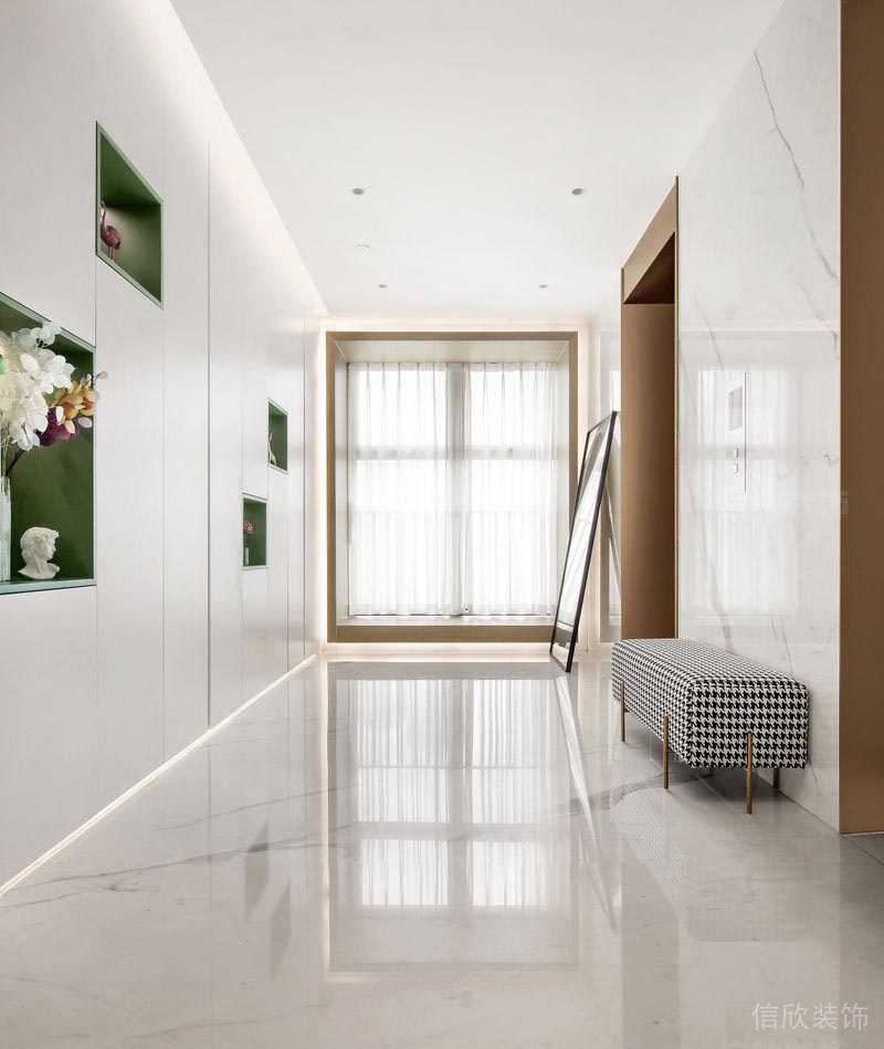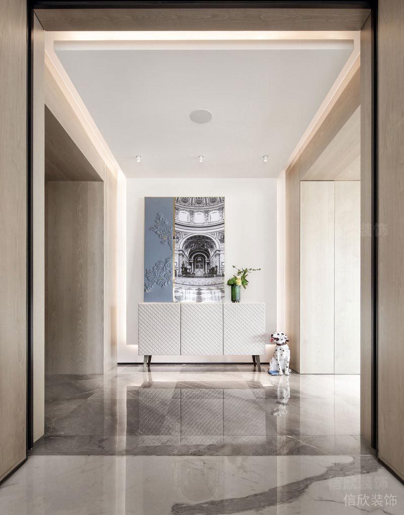銀灰色的天然地面,原木色的木飾面板,配合銀白細長的燈光和玄關掛畫;讓您如同步入夢境一般的奇妙。