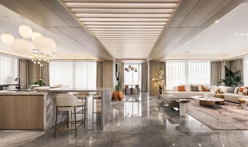 步入入戶,真?zhèn)€灰色系構成的地面,原木格柵頂?shù)脑煨?,明亮寬敞的大廳,讓人感覺奢華和貴氣撲面而來。