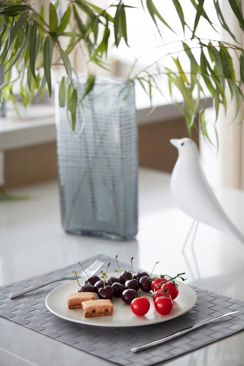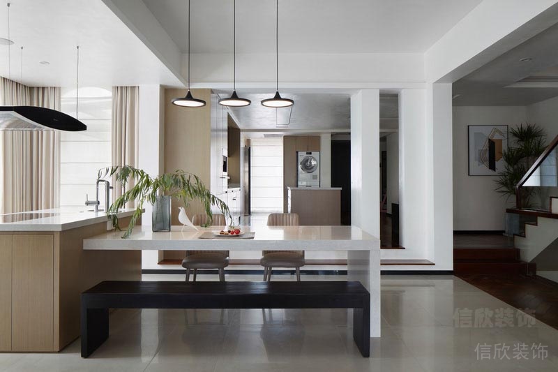 深圳中山區(qū)南頭東關(guān)·樂尚林居餐廳 白色天然人造石餐桌,帶洗手盆的配置,實(shí)用方便,功能性強(qiáng)。