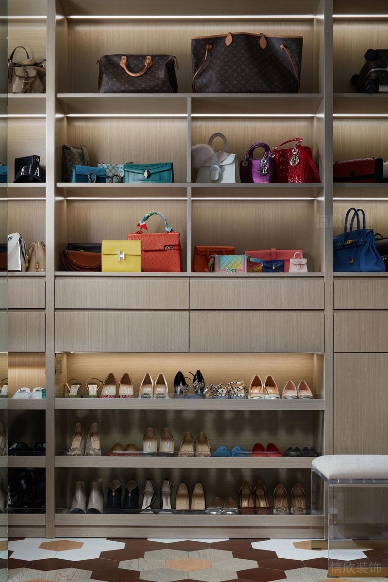 深圳中山區(qū)南頭東關(guān)·樂尚林居衣帽間 原木色的衣柜,配黑色的茶色玻璃,寬敞的衣帽間,是每一個(gè)精致生活的女人,必備之選。