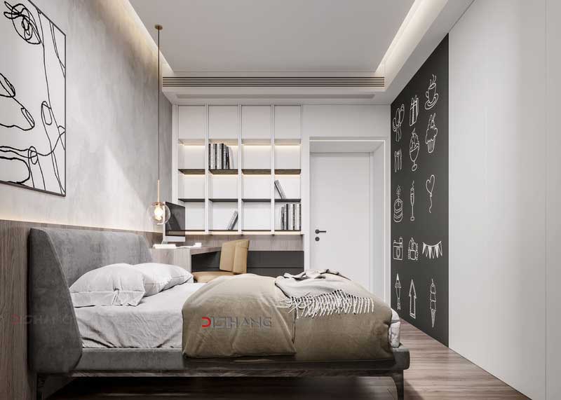次臥采取原木風(fēng)的地板和白色的墻面,通過木飾面板的背景墻,和水泥色的墻面,來承接和點(diǎn)綴,這樣做凸出了墻面的水泥肌理和美感,同時(shí)擁有北歐風(fēng)情的細(xì)膩情感。