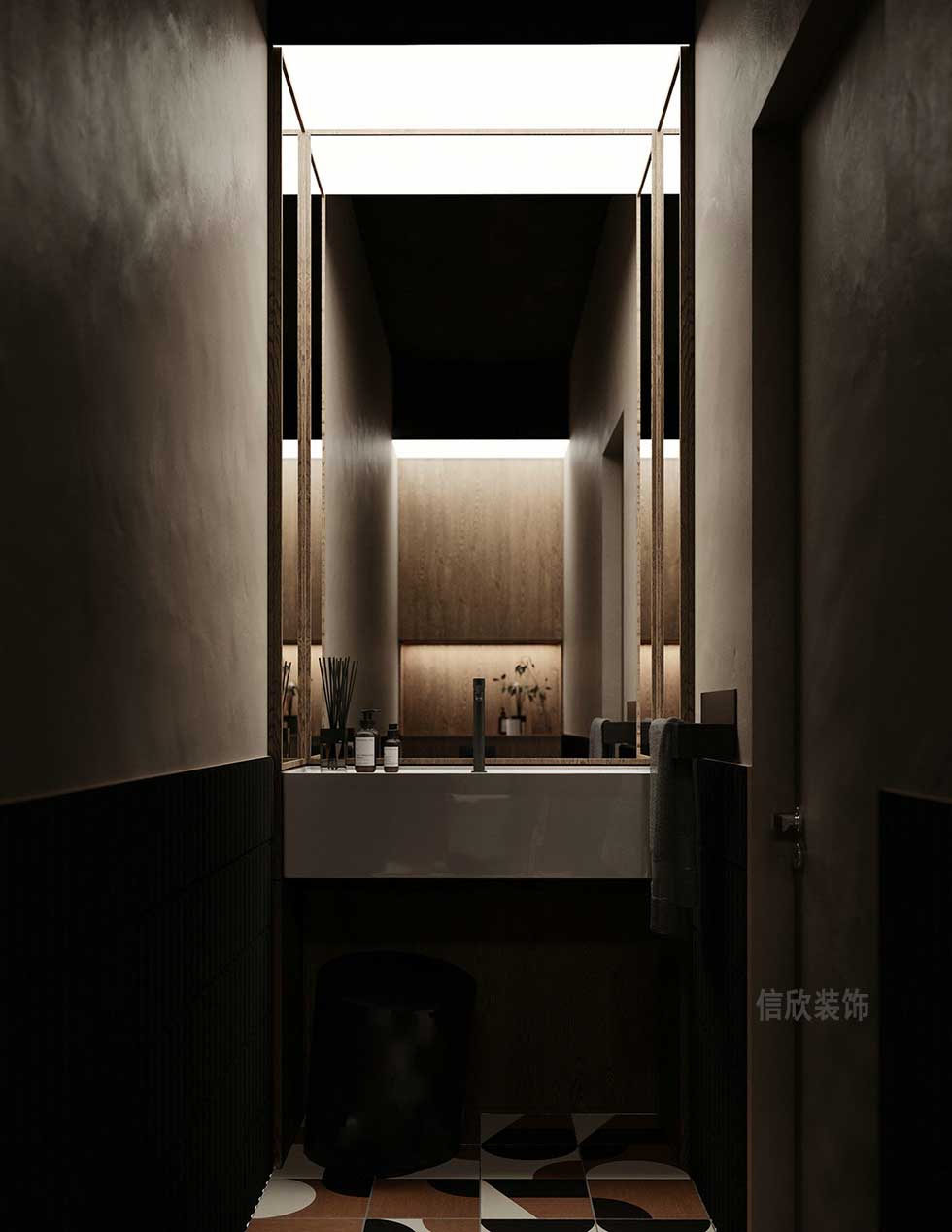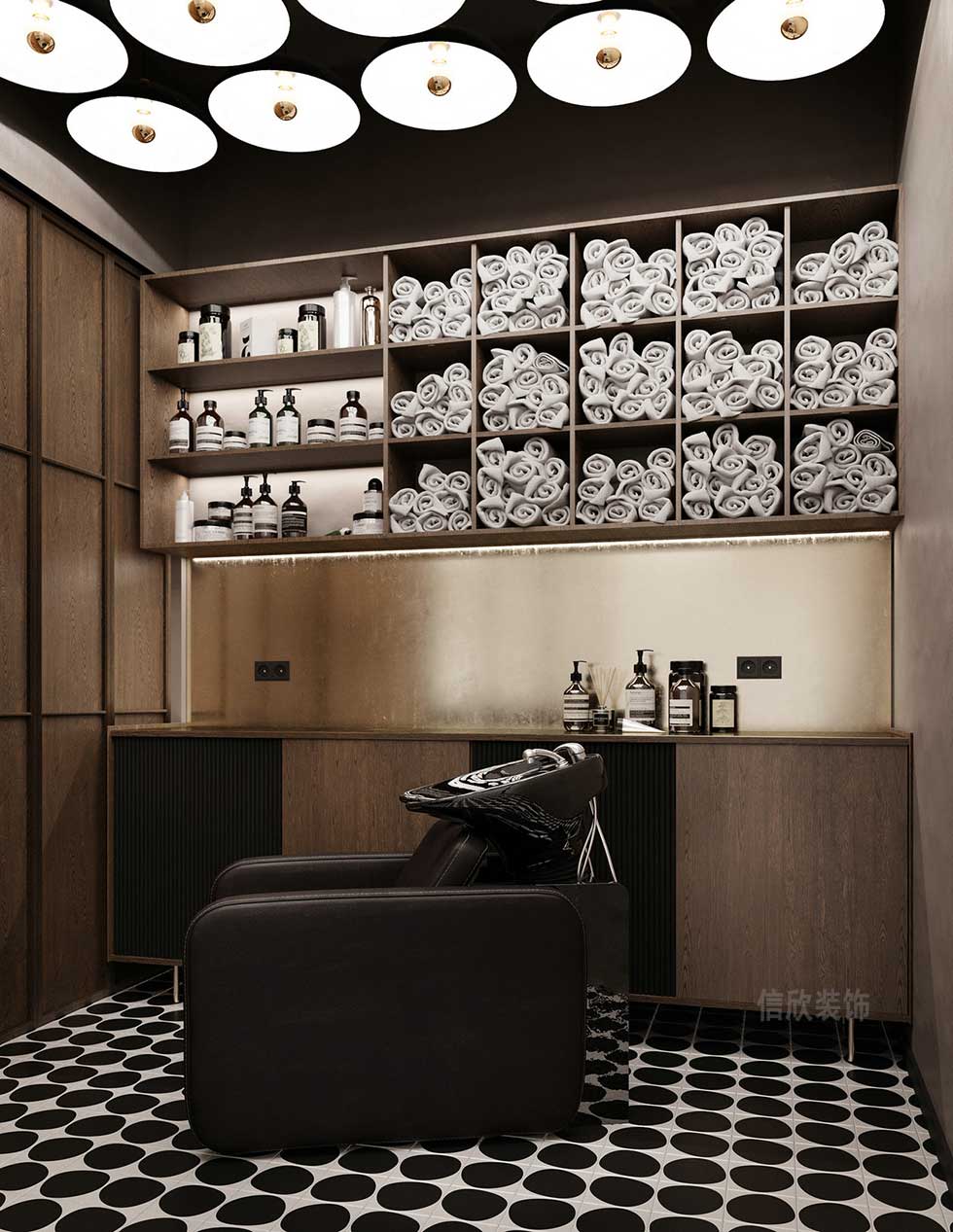 和大廳做了獨(dú)立分隔的洗頭區(qū),復(fù)古式的木門,可選擇開放或者不開放,頂面的射燈和地磚相呼應(yīng)的經(jīng)典黑白搭配,看上去很有對稱的美感,更有不屬于奢華裝修的優(yōu)美。