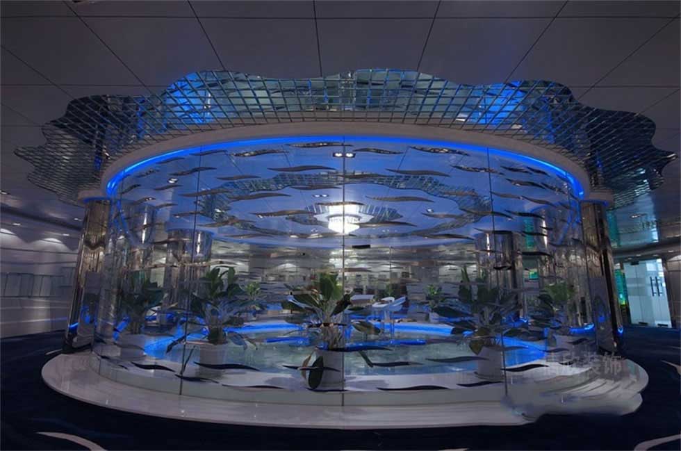 和圓形頂面對應的中心展示區(qū),既有凸出重點,又能體現出區(qū)域分隔的妙處,半透明玻璃的材質,可以起到一定的隱私性,同時從外面看起則是一副似魚兒在游動夢幻般的場景。