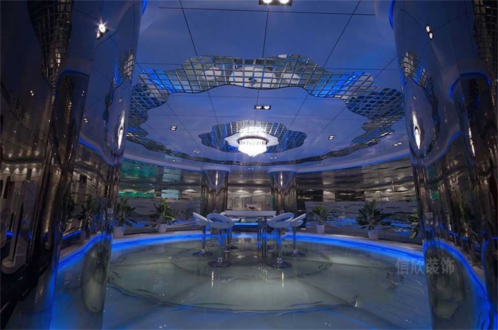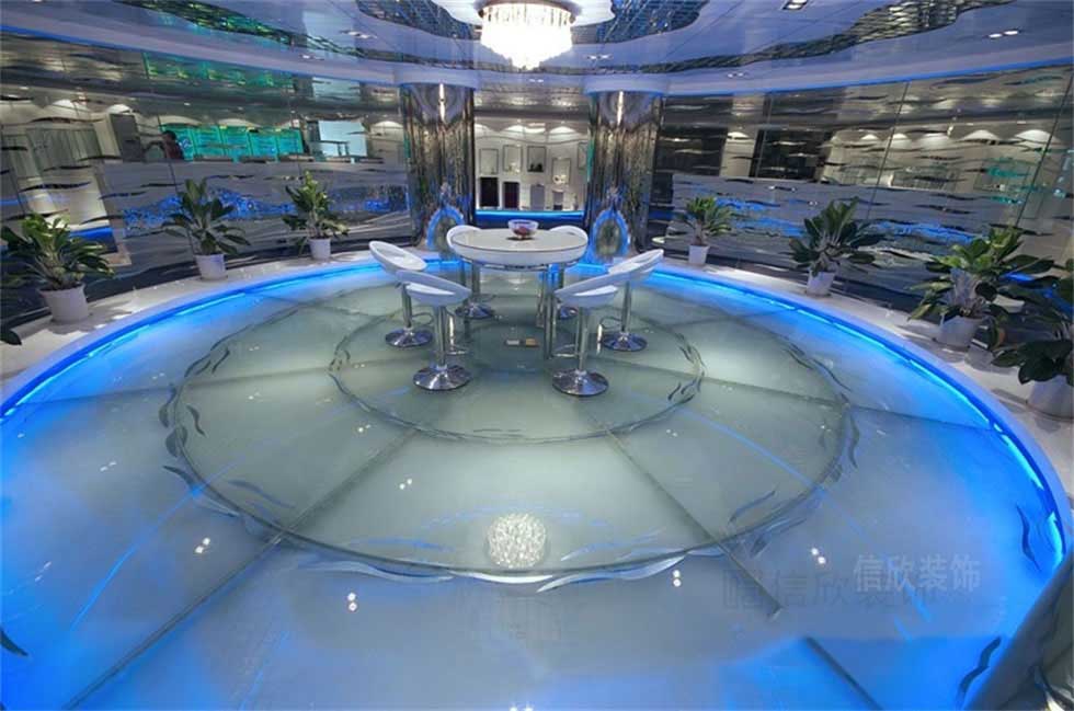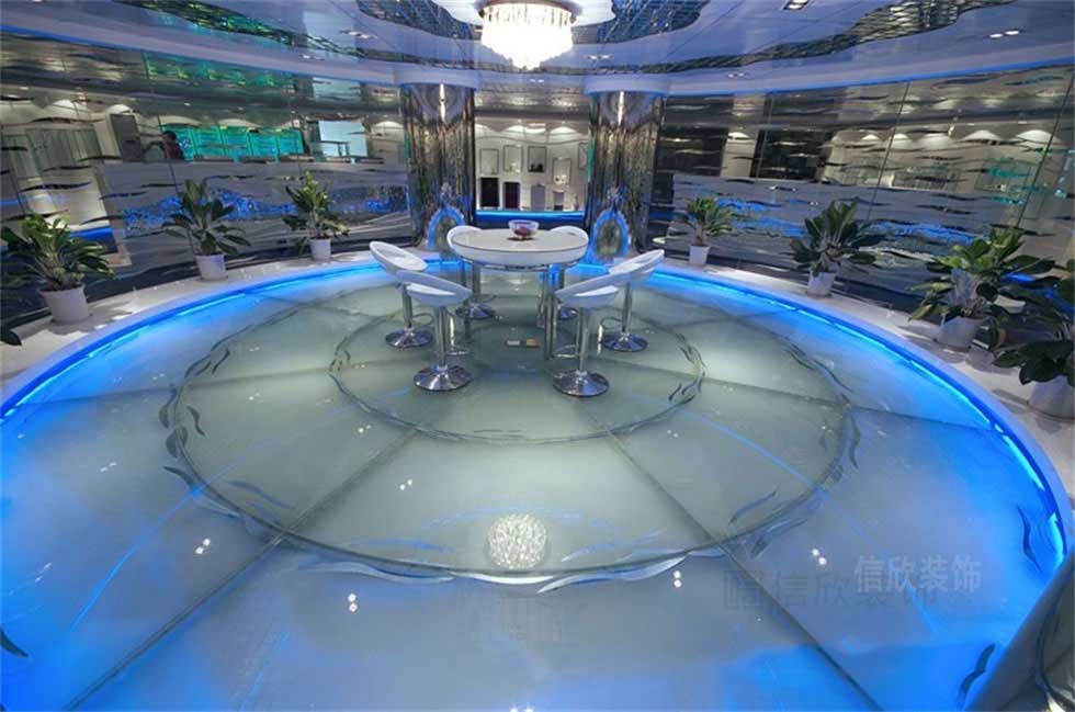 圓形的玻璃房間展區(qū),玻璃的地面在燈光的作用下,泛起微微的藍色光澤,圓形密封的玻璃外墻,水晶燈主吊燈照射在頂面上,白色圓形的小洽談桌,大圓套小圓的立體設計模式,前衛(wèi)現代而且給人一種身處于科幻世界中的體驗美感。