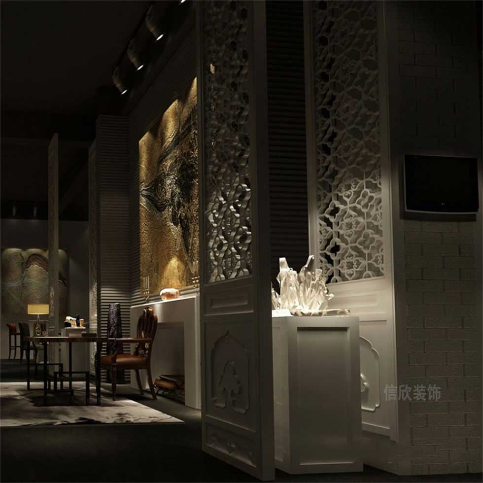 設(shè)計理念:本案是一所混合型風(fēng)格的收藏品展廳裝修設(shè)計案例,混合型風(fēng)格是現(xiàn)在比較潮流的一種裝修風(fēng)格,它將古今中西融合于一體。如:傳統(tǒng)屏風(fēng)、擺設(shè)配以現(xiàn)代風(fēng)墻面及門窗、沙發(fā),給人一種時尚、與眾不同的感覺。而且混合型風(fēng)格的裝修在設(shè)計中不拘一格,總能給人煥然一新的感受。