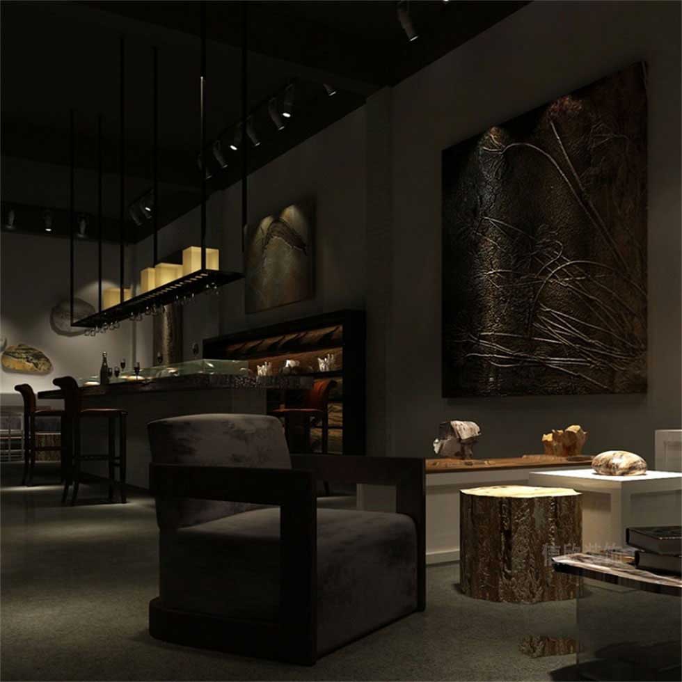 黑色的酒柜和白色的展柜以及家具,做了一個顏色的對撞,黑白的經(jīng)典百搭色形成了鮮明的對比,在昏暗的環(huán)境氣氛烘托下,灰色的微光更能讓展品本身的美感脫穎而出,令人沉醉。
