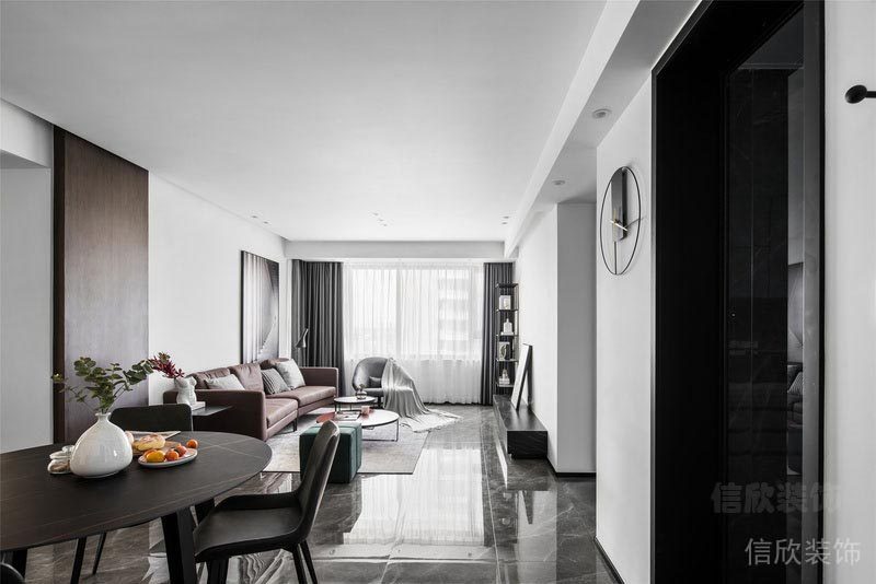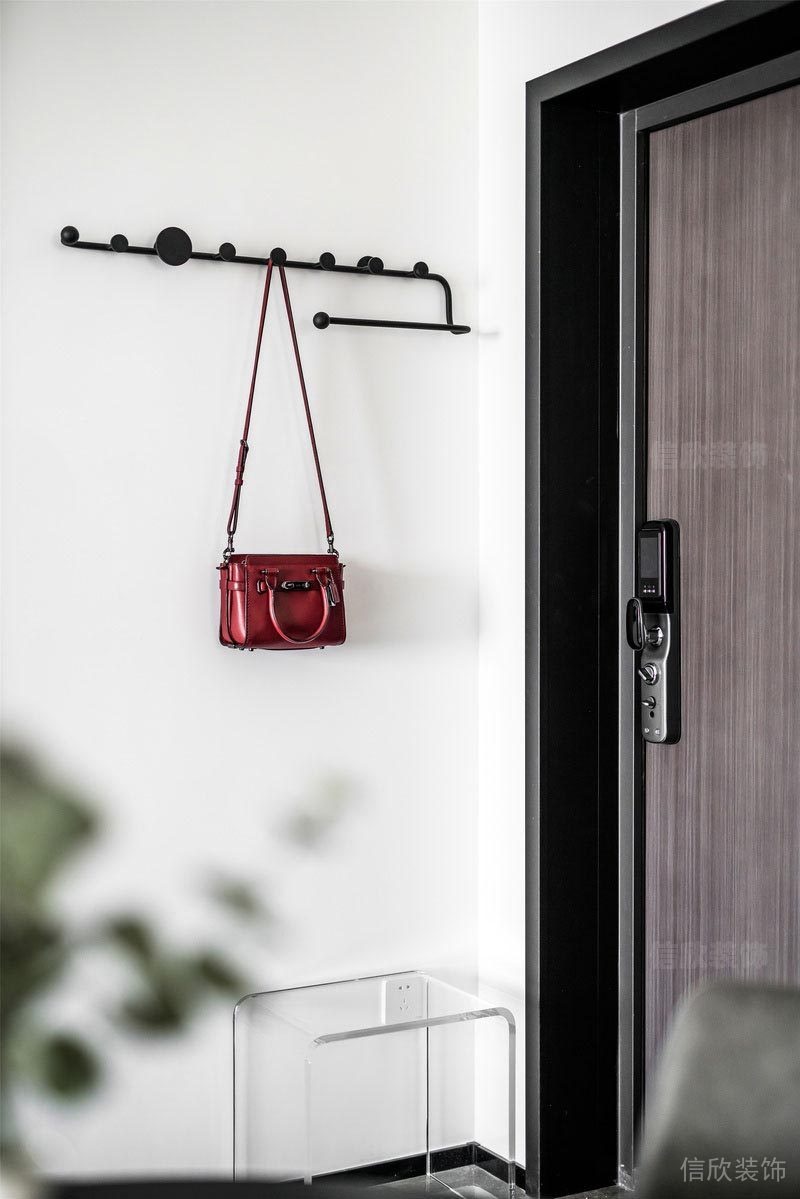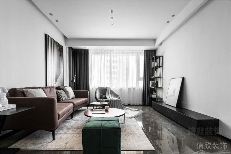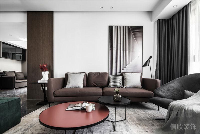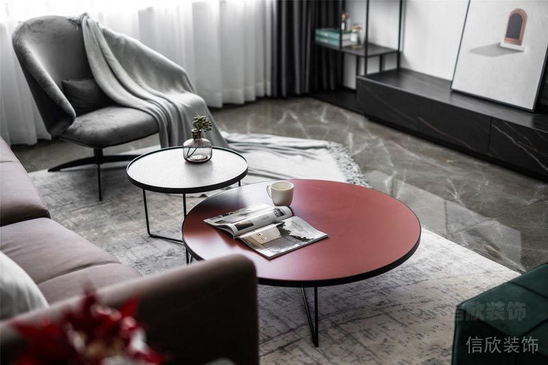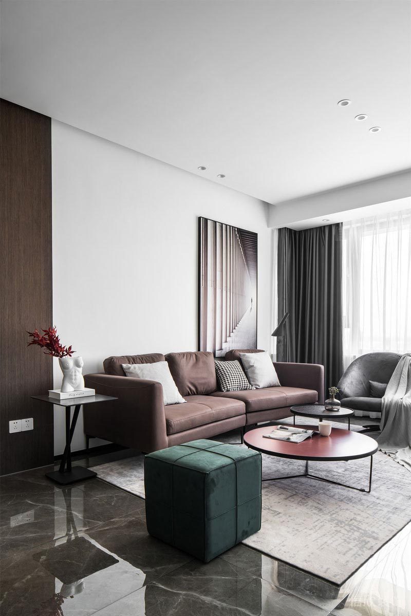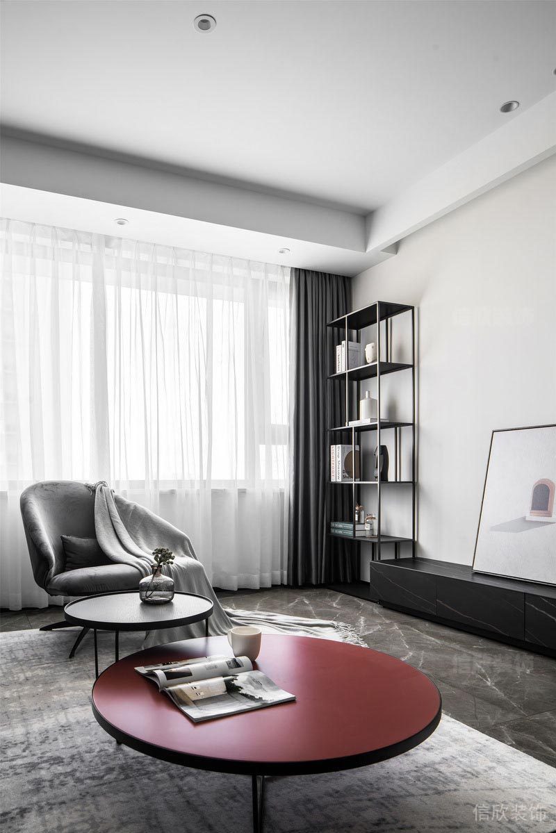 客廳以黑白灰為基調(diào),灰色為輔。 整體空間線條干凈利落, 體現(xiàn)出現(xiàn)代簡(jiǎn)約生活的品質(zhì)感。 低飽和度的紅色茶幾與綠色矮凳的撞色點(diǎn)綴, 也讓整個(gè)空間靈動(dòng)起來(lái)。