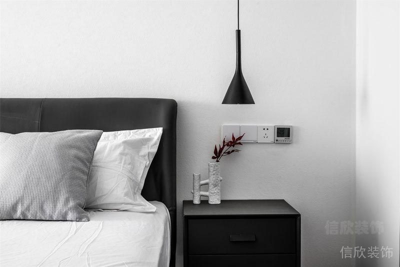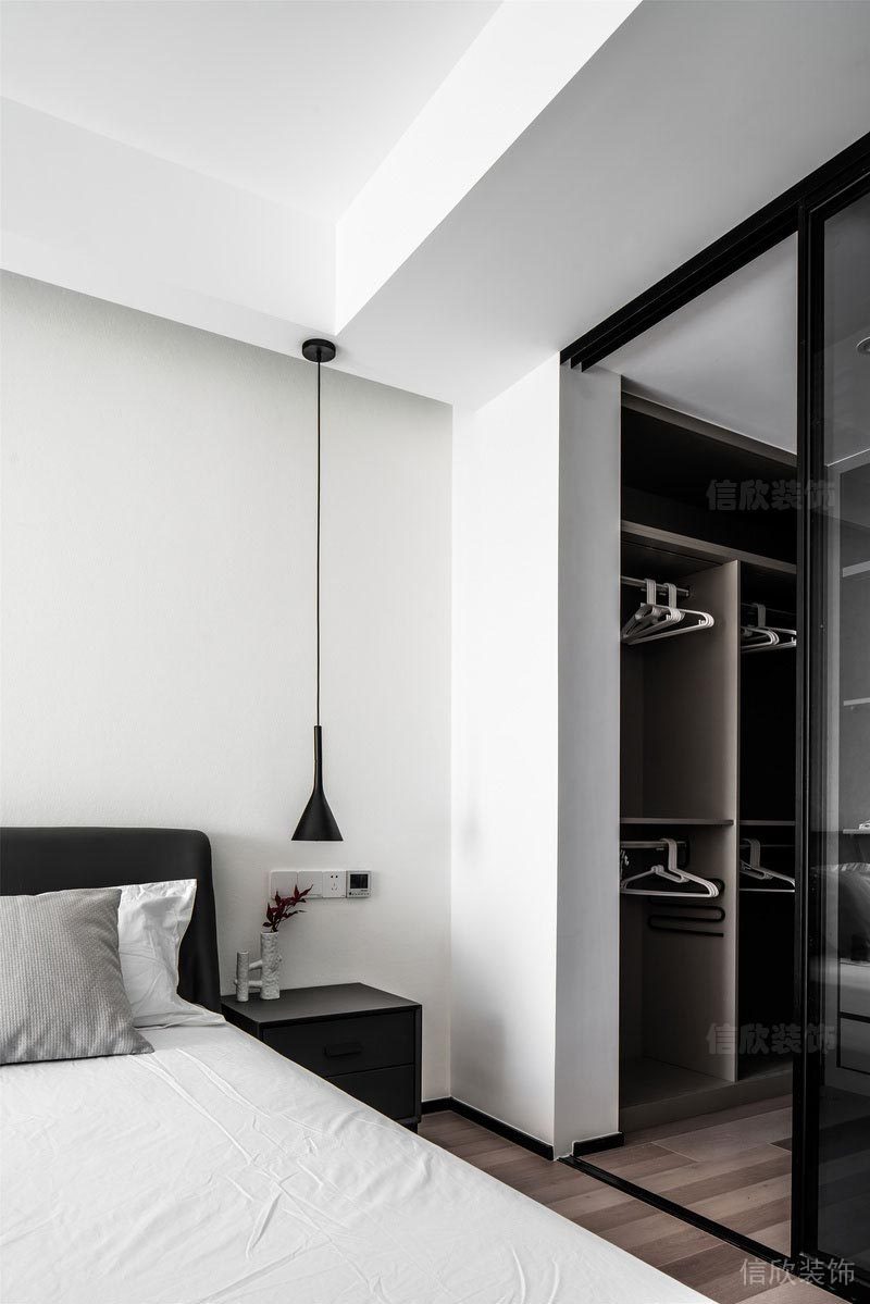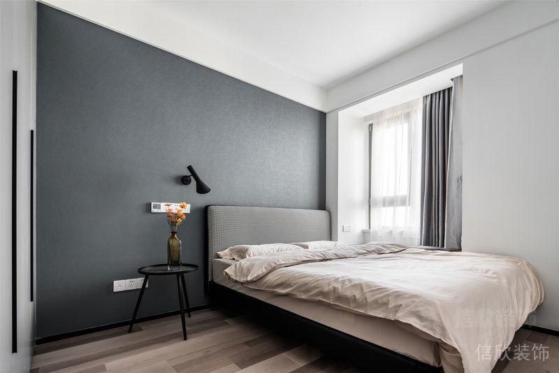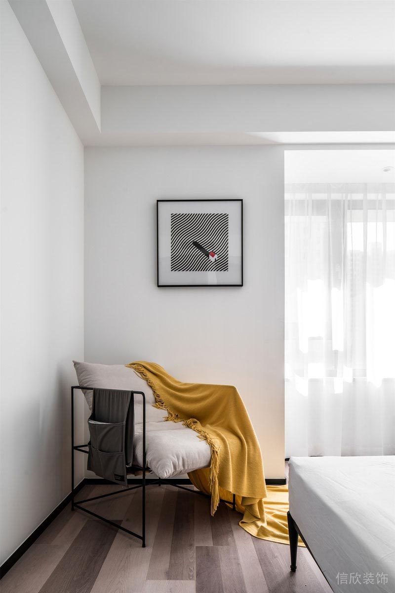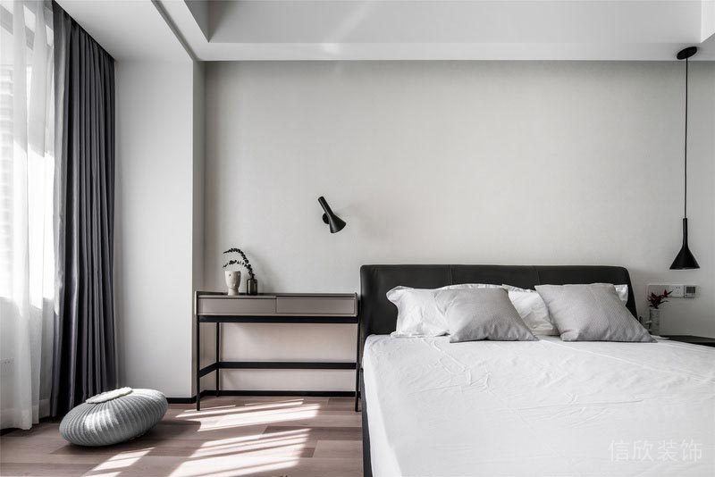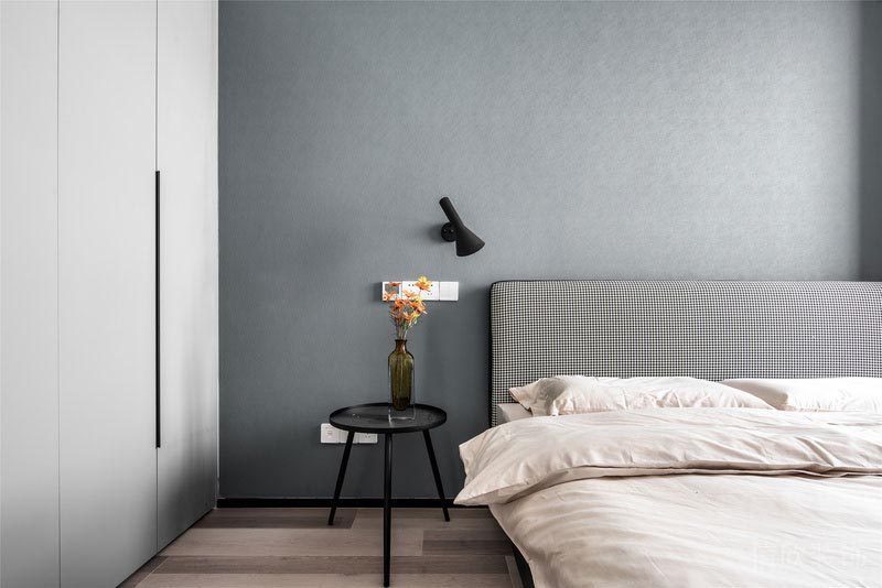 主臥室同樣是純凈的無(wú)主燈設(shè)計(jì)多了溫柔的氣氛 為了不浪費(fèi)光線和風(fēng)景,去掉繁瑣的臥室背景墻 將視覺(jué)焦點(diǎn)往下延伸,房間也更寬敞輕盈 在黑白的空間關(guān)系里 加入同樣簡(jiǎn)單而不失質(zhì)感的灰調(diào) 是設(shè)計(jì)師對(duì)簡(jiǎn)約生活的極致表達(dá) 陽(yáng)光不經(jīng)意灑落,簡(jiǎn)單的美好躍然展開(kāi)。