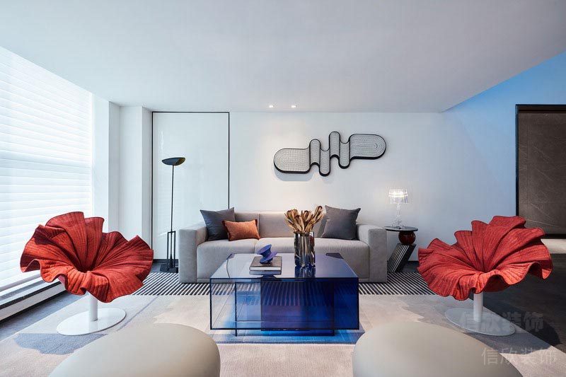 猶如絢爛綻放的花朵造型座椅靜置于等候區(qū),中央則安放著交錯疊層的透明茶幾。其間碰撞交融的烈焰紅與經(jīng)典藍搶奪了所有目光,衍生出兼具時尚新潮與藝術氣息的場景。