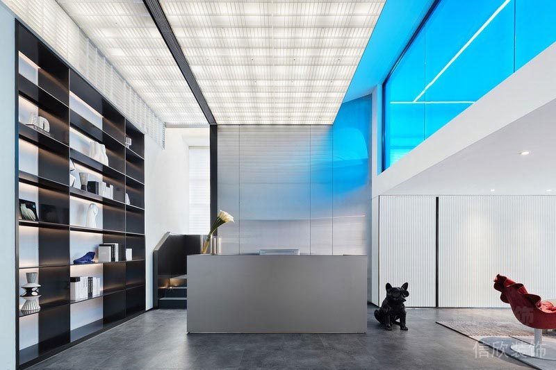 靜謐且耀眼的藍映襯在白、灰鋪陳的底色中,以極具沖擊力的視覺元素激活空間活力。前臺空間糅合多元卻不失驚喜,給予進入者無限的遐想。