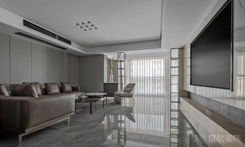 灰咖兩色的單一背景墻,冷色調(diào)的飽滿色感,現(xiàn)代皮質(zhì)沙發(fā),潮流感十足。