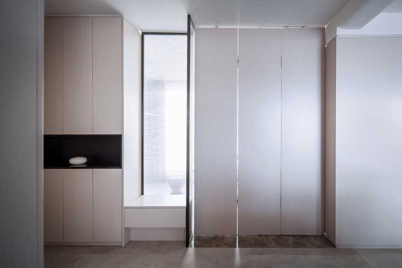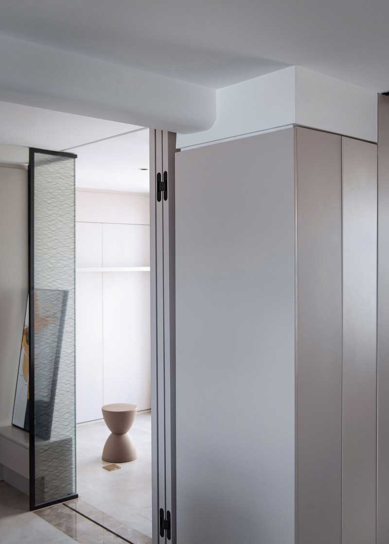玄關(guān)的設(shè)計(jì),采取房間原墻體的方式,用鞋柜和換鞋凳,以及可移動(dòng)隔斷,這樣不僅鞋柜不會(huì)占地方,拉開(kāi)隔斷就是一間因殘的會(huì)客室,關(guān)閉則是一個(gè)隱形的整墻鞋柜的精妙設(shè)計(jì)。