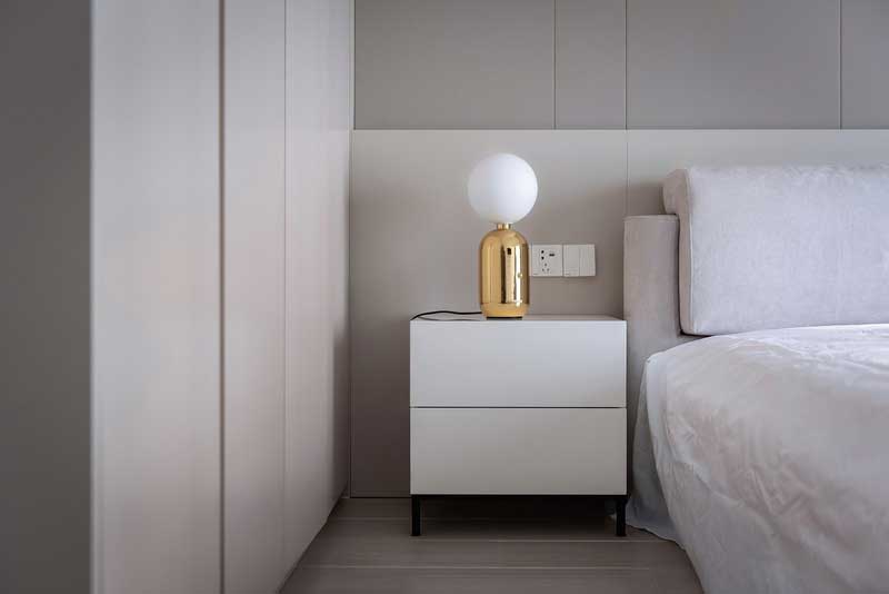 隱藏式的衣柜設(shè)計(jì),和背景墻融為一體,看上去更協(xié)調(diào),素雅的顏色,軟包床頭背景墻,顏色變化不多,但線條感非常明顯,加上香檳金燈具,簡(jiǎn)約中透出歐式輕奢的優(yōu)雅設(shè)計(jì)特點(diǎn)。