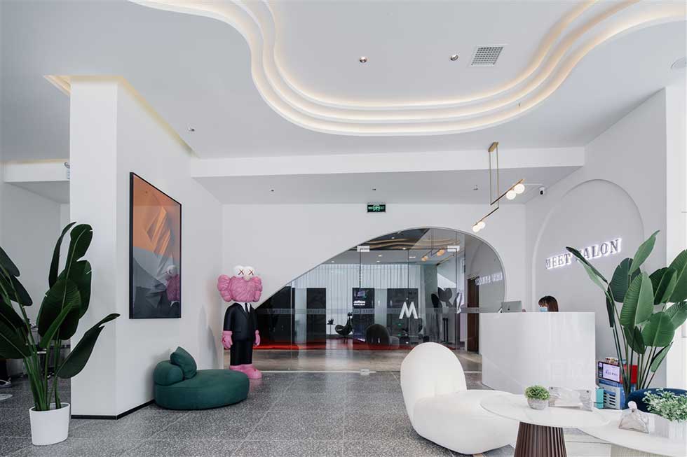 圓弧形的背景,和半圓弧門洞,花瓣頂面相呼應(yīng),既能體現(xiàn)整個空間的協(xié)調(diào)性和統(tǒng)一性,又顯簡潔耐看,立體式的前臺,線條感流暢,層次分明而立體感強烈。