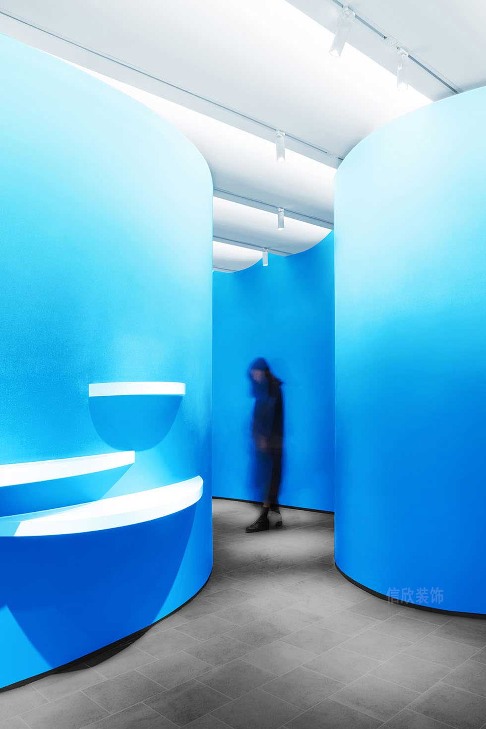美容院室內(nèi)具有柔和的弧形墻面,覆以藍(lán)白的漸變效果,身處其中,仿佛置身于海霧和海浪之中。這些弧形墻面將整個(gè)空間以流暢的方式連接起來(lái),并在確保空間開(kāi)放性的前提下,將美容院空間分成了不同的區(qū)域,以便在小區(qū)域內(nèi)進(jìn)行各種服務(wù)和活動(dòng)。