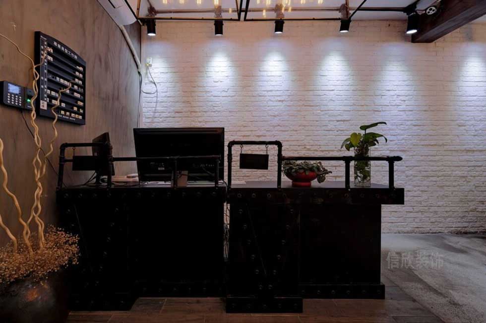 白色的文化石背景墻,點(diǎn)綴出粗獷的文藝氣息,黑色實(shí)木帶金屬圓釘?shù)那芭_,鐵藝的手工黑色吊頂,在黑白兩種色調(diào)的對撞下,給人一種古老而神秘的既視感。