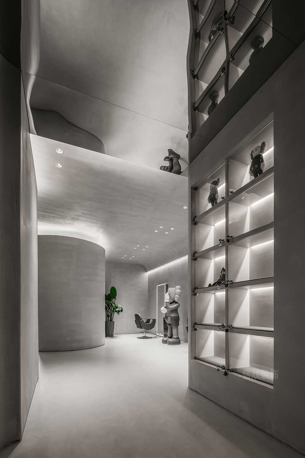 精神性可以被具象或抽象地表達(dá),設(shè)計(jì)師在有限的空間內(nèi)尋找屬于空間本身的最簡(jiǎn)潔有力的語言。區(qū)別于市中心的喧鬧,空間靜靜將人引入脫離平庸的新銳世界,遵循了獨(dú)特的質(zhì)感邏輯,隨物賦形,創(chuàng)新與融合空間造型。