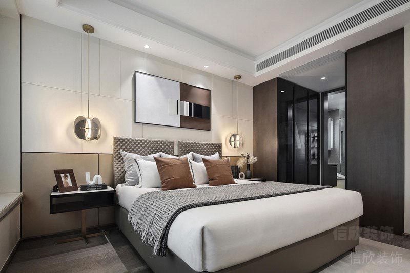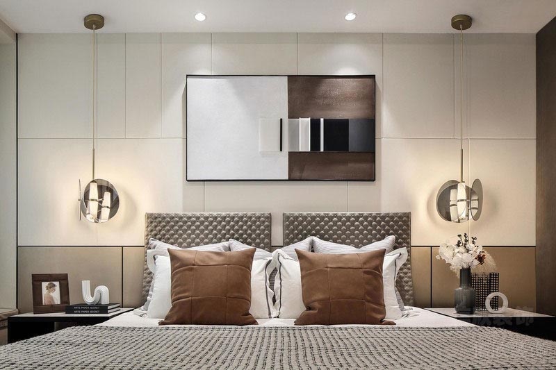線條感強烈的背景墻,幾何圖案的掛畫,加金屬風(fēng)的吊式臺燈,裝點簡約的奢華感,不做多余的裝飾,但沒有一樣裝飾是多余的,讓忙碌一天的你,在布藝的軟床中,輕輕的入夢。
