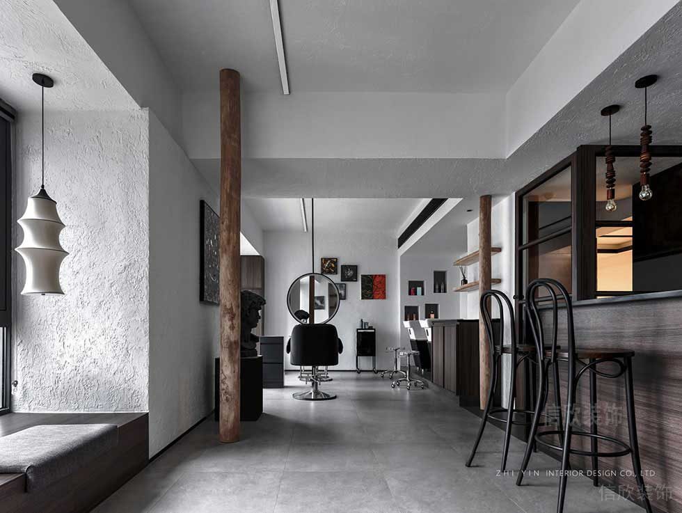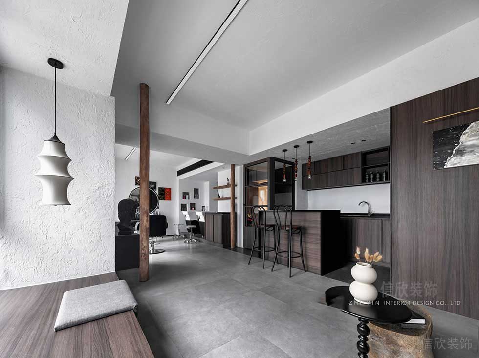 前臺作為小吧臺的形式,深色木紋的肌理效果,藝術(shù)內(nèi)涵和文青氣息爆棚,同時給人一種高端的灰色的私密性,取代了傳統(tǒng)門庭若市感覺,增加了客戶自我肯定和特殊性。