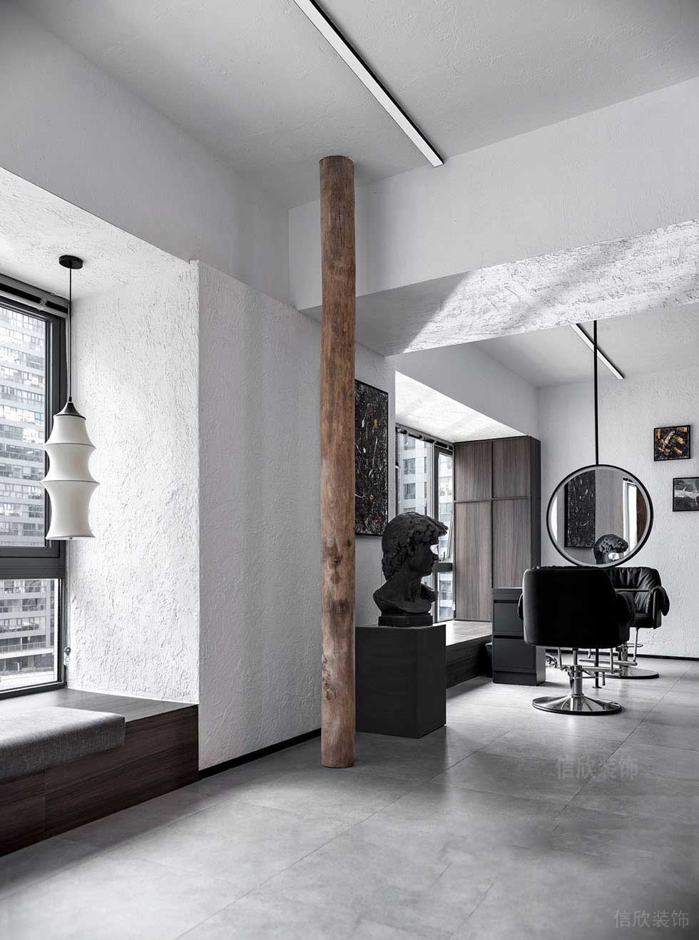 設(shè)計理念:這是7月份開始設(shè)計的一家美發(fā)店,從店面選址的時候開始,跟業(yè)主去過現(xiàn)場,咨詢我這個地方行不行,最開始的是兩個單獨的公寓形式,沒有面寬面寬不夠,如果是單獨過于小了,跟房東和物業(yè)溝通過后,兩個房間可以打通。這樣的改造就會好很多,從平面方案和前期概念的溝通到施工落地,這個經(jīng)歷過的過程是比較順利的,因為我們想做的感覺和業(yè)主喜歡的氛圍契合度很高,這是落地后的實景拍攝,前期的效果圖方案可以翻我主頁里面有。從設(shè)計到硬裝施工再到軟裝都是由我們完成,因為預(yù)算問題,在后期軟裝和選材上面有所調(diào)整。最終落地效果還算可以,設(shè)計不是一開始就是最好的,落地過程的質(zhì)量才是最終的效果,在施工過程中調(diào)了進門的天花處理,原設(shè)計效果是平頂,后面施工中調(diào)成了弧度帶燈帶方式,這樣提高了層高和空間層次感,入口一個退讓的空間增加了打卡區(qū),也是為了避免客戶在門外等候的尷尬,從一個公共過道到真正入口的過渡。
