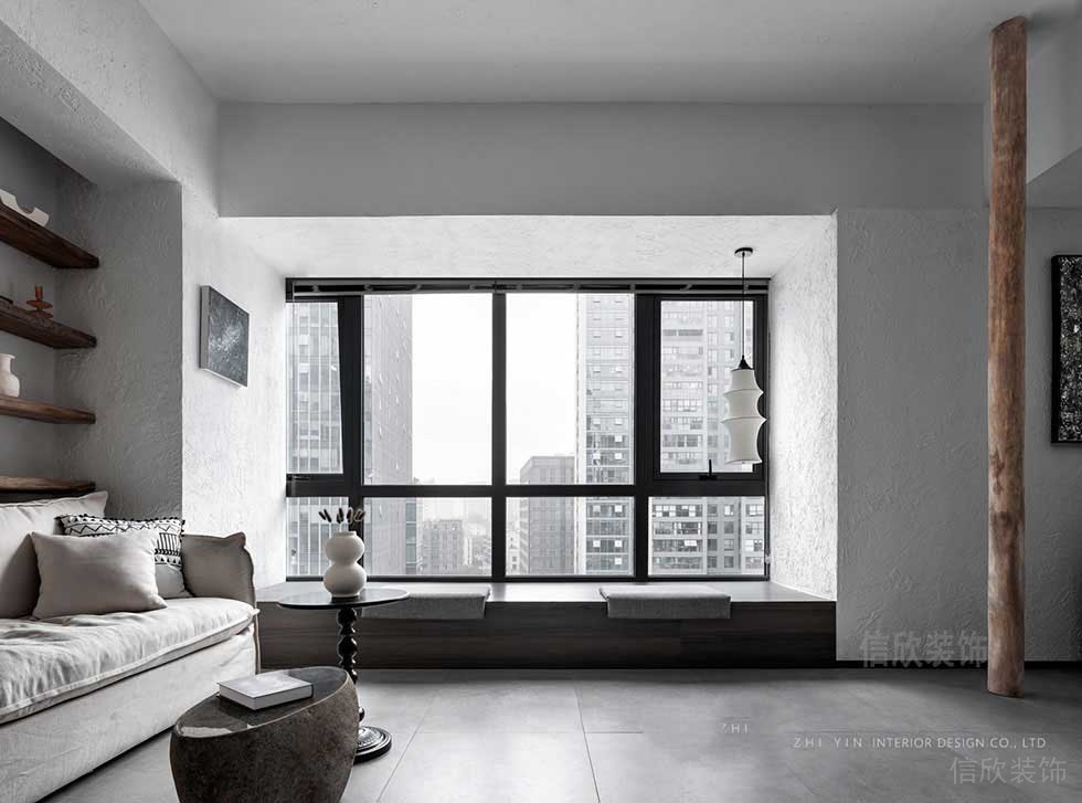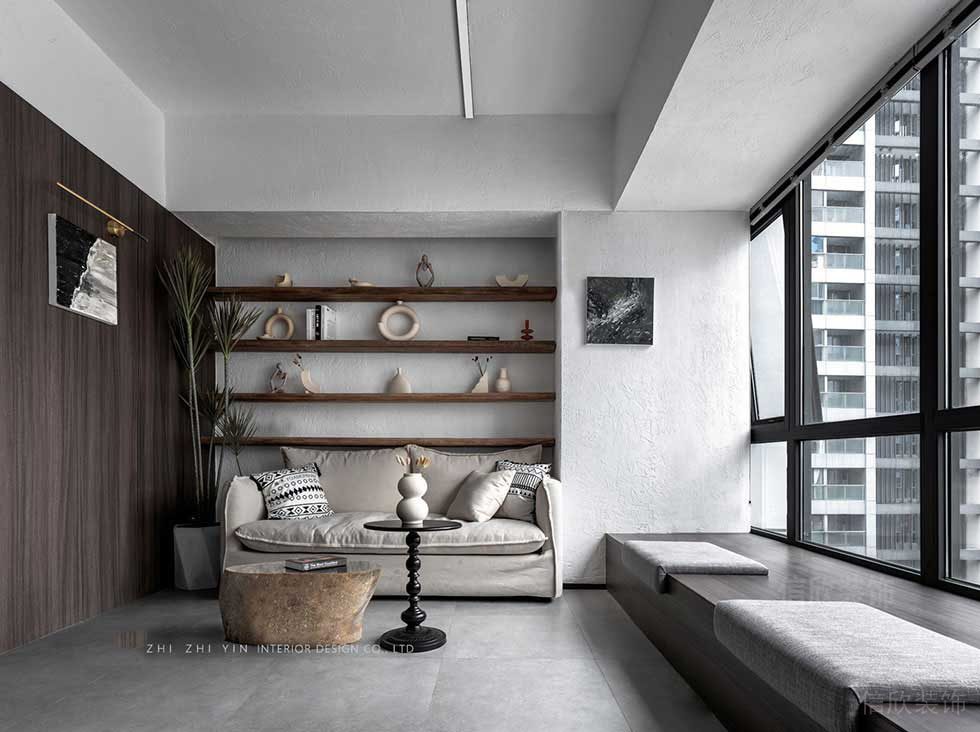 依窗而建的小洽談區(qū),置物板的北歐元素和布藝沙發(fā),光線明媚充足,通過顏色對比的方式,由淺而深的逐層遞進,使空間的色彩應(yīng)用更富有層次感。
