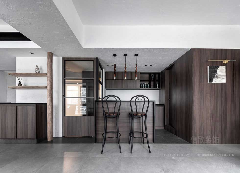 入戶區(qū)域的設(shè)計做了一個空間的引入,通過砂礫和黑色背景墻和柱子等元素的表達方式,達到一個既有設(shè)計感,又富含藝術(shù)氣息的形式,打開人們的好奇心。