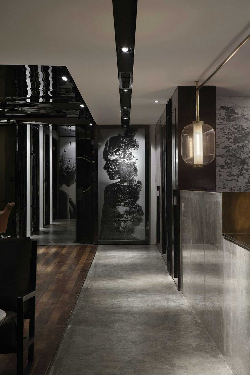 室內(nèi)空間為直長(zhǎng)型低矮空間,天花板用鏡面不銹鋼延伸了空間高度,設(shè)計(jì)師運(yùn)用不同的材質(zhì)在空間中綜合運(yùn)用,不同的肌理形成有節(jié)奏的韻律感;黑白灰作為主基調(diào),金屬感強(qiáng)調(diào)了工業(yè)感,試整個(gè)空間顯得輕盈奢華。