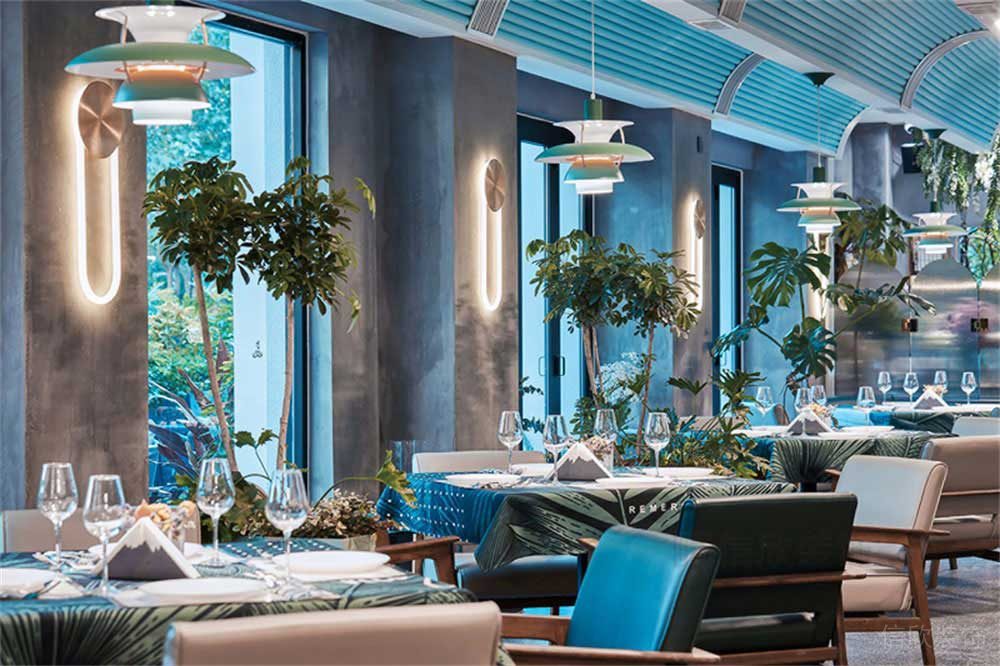大廳的裝修,沿用了原始結(jié)構(gòu)的灰色墻面,灰色的星點地面,在地中海一樣的湛藍色彩中,食客們可以邊用餐邊通過落地式的窗戶,品嘗著美味的食物享受海邊度假般的愉悅時光。