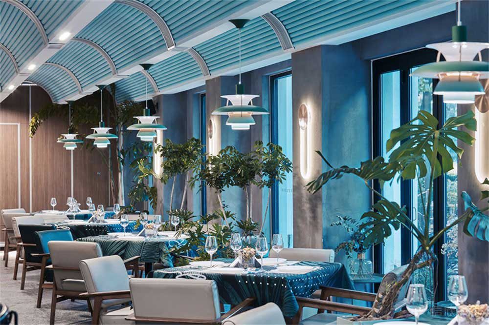 波浪形的圓弧頂面,層次感極強的鋁扣板,象征著大海一樣蔚藍的顏色,在光影的折射間,食客們耳邊似乎回蕩著地中海邊的浪漫愛情故事和關(guān)于奧林匹斯山中希臘眾神的英雄史詩。