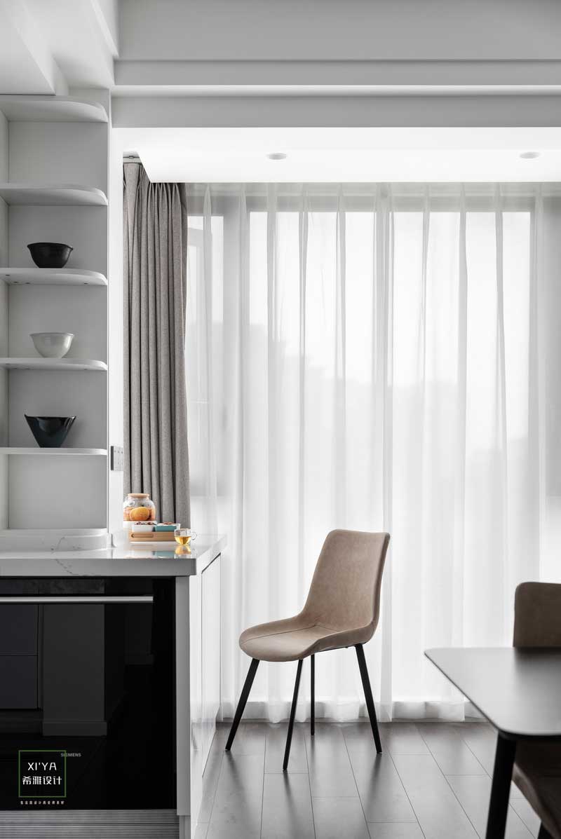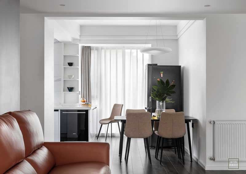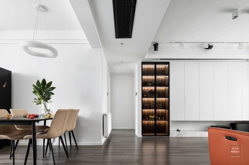 客廳的設(shè)計(jì),以干凈清爽的純白色調(diào)為主體,雙眼皮的吊頂,著重區(qū)分了客廳的空間區(qū)域分隔型,無(wú)主燈的設(shè)計(jì),工業(yè)感的軌道射燈,直射式的投影儀,在強(qiáng)調(diào)了功能性的同時(shí),讓整體充滿了現(xiàn)代感和使用的功能性。