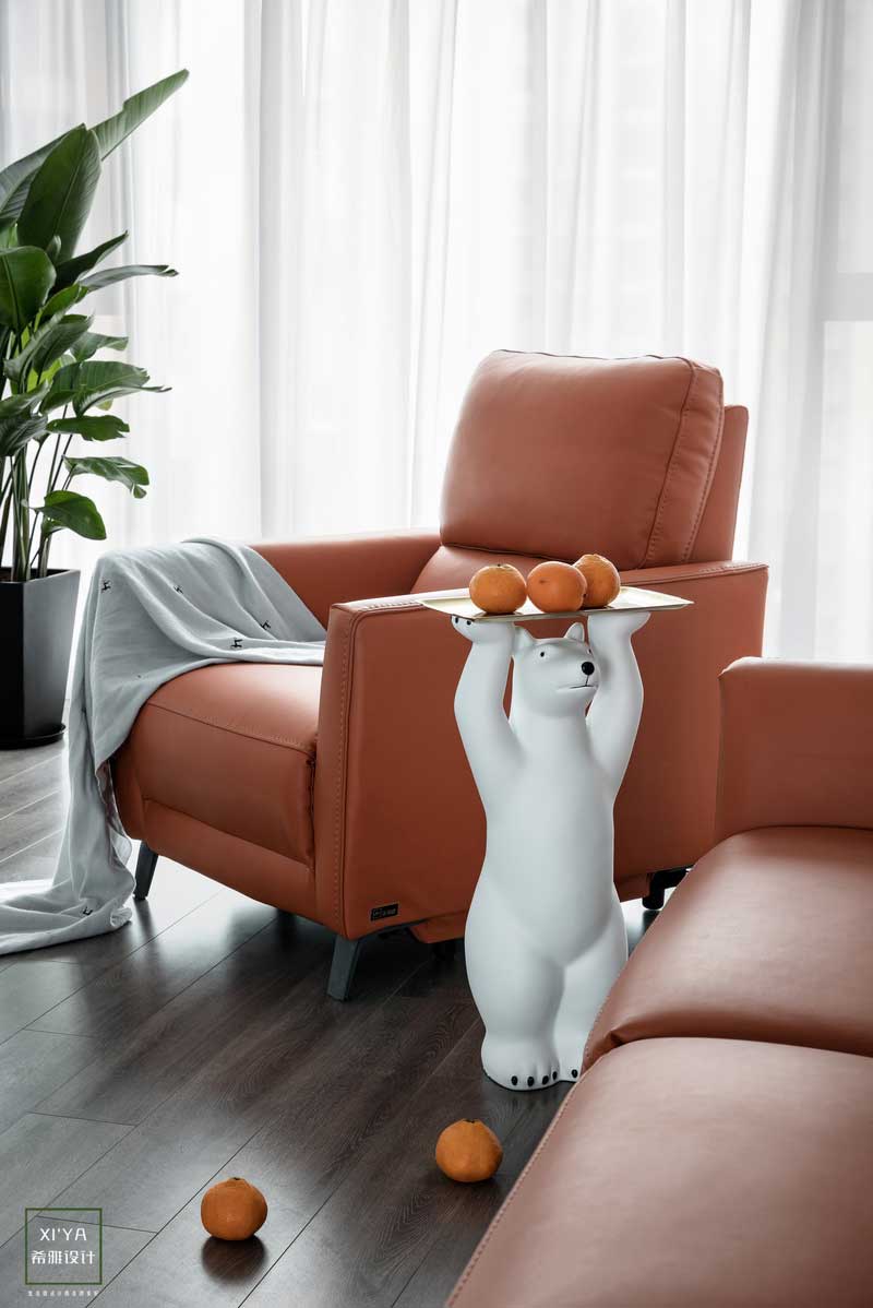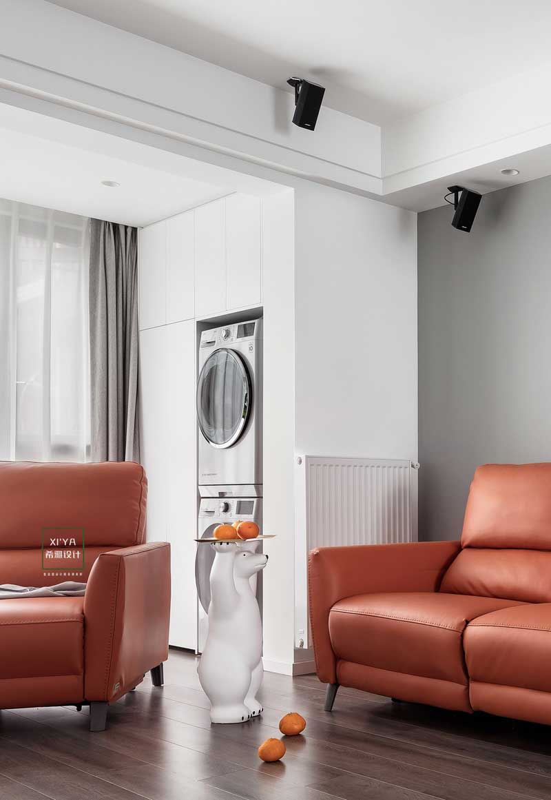 白色的墻面,咖啡色實(shí)木紋理的地面,搭配上皮藝的沙發(fā),給人一種自然原始的現(xiàn)代北歐風(fēng)情,橘紅色的顏色設(shè)計(jì),讓白色的空間,注入了一絲活躍靈動(dòng)的氣氛感。