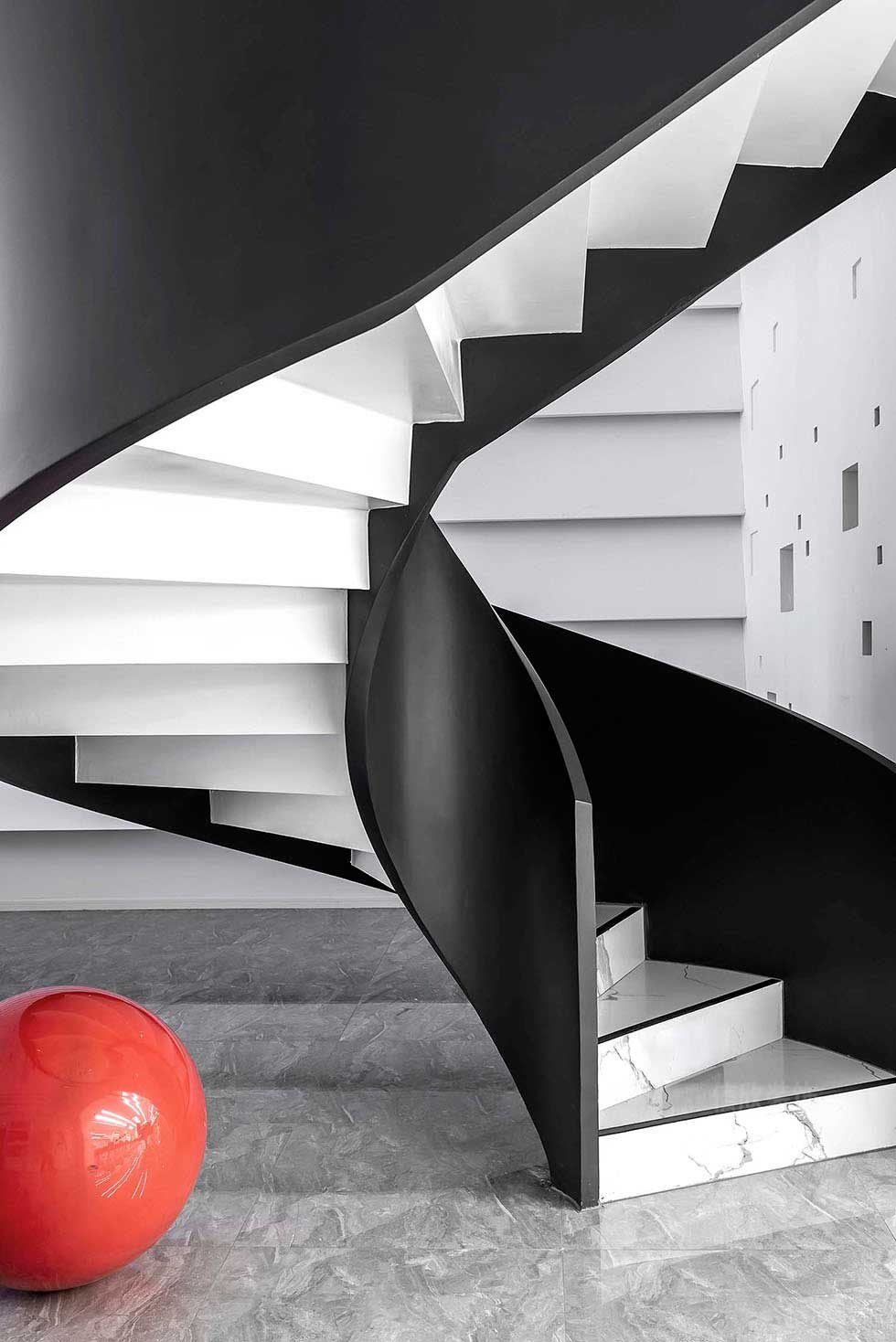 一層大廳的弧形入戶(hù),不僅成為景觀步道,也成為了客戶(hù)的等待區(qū),將空間的藝術(shù)性與實(shí)用性無(wú)聲的結(jié)合。映入眼前的旋轉(zhuǎn)樓梯,將VIP客戶(hù)帶入美麗的時(shí)光隧道。