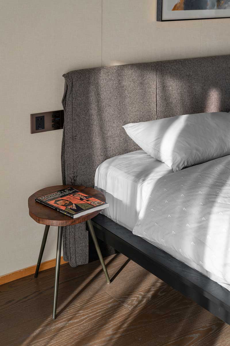 主臥家具以高級(jí)灰質(zhì)感為主,靜謐的色調(diào)也使空間充滿(mǎn)寧?kù)o的氣息。床頭背景墻改造成了整面水洗秋香木紋的護(hù)墻板+隱形門(mén),令空間更加平衡,既有工業(yè)風(fēng)的粗獷感,造型又很簡(jiǎn)約,與現(xiàn)有裝修基礎(chǔ)完美融合。