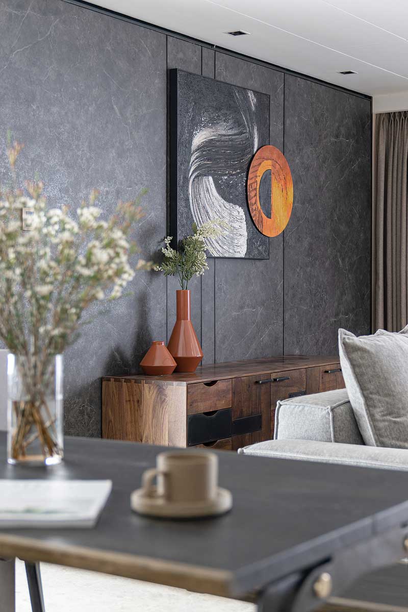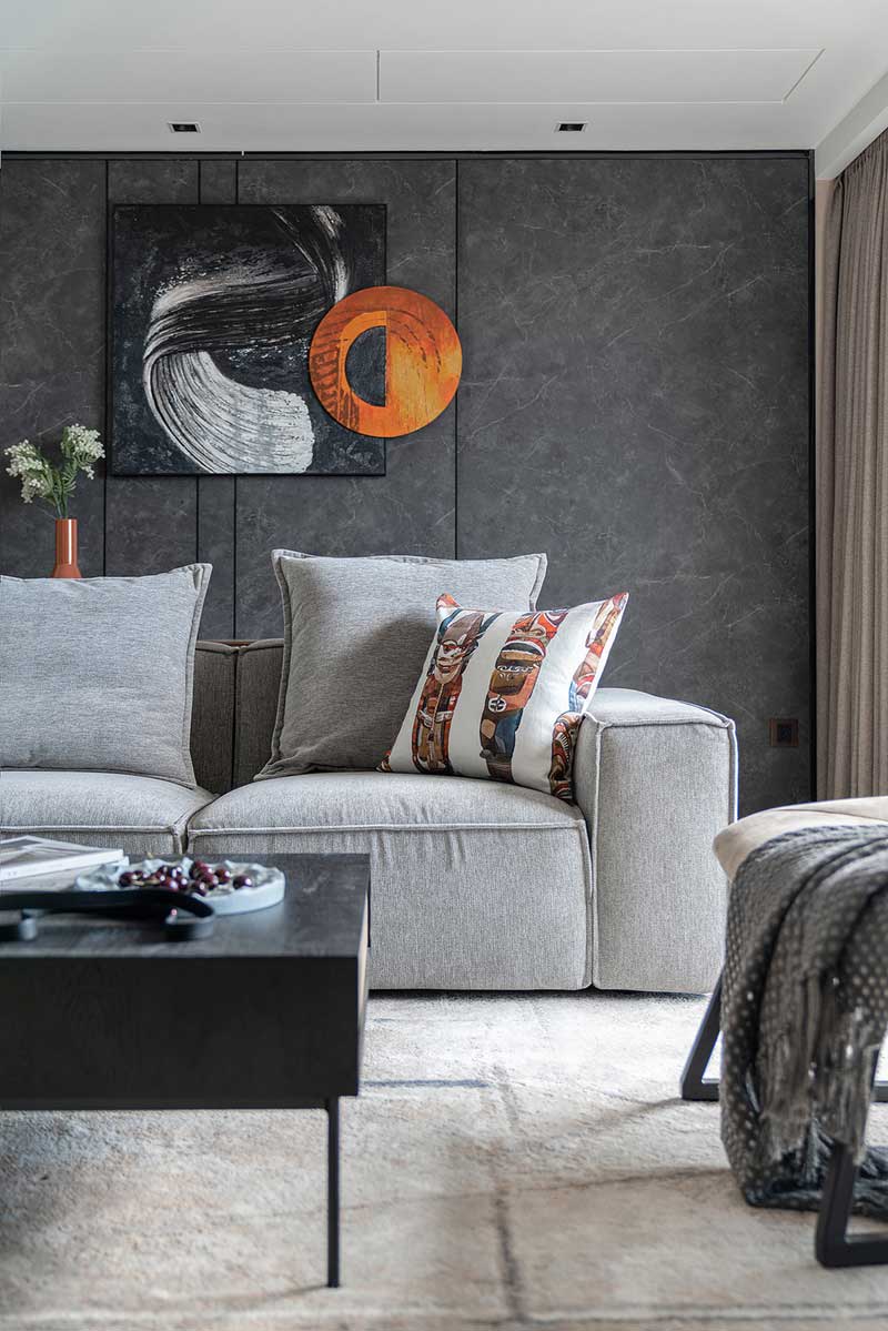 黑色大巖板的沙發(fā)背景墻,和不銹鋼材質(zhì)的結(jié)合,是客廳的亮點(diǎn)所在,深色調(diào)的完美攝入,把黑色的神秘和深邃感體現(xiàn)出來(lái),空間看起來(lái)不再單調(diào),反而有一種雅致的藝術(shù)生活感。