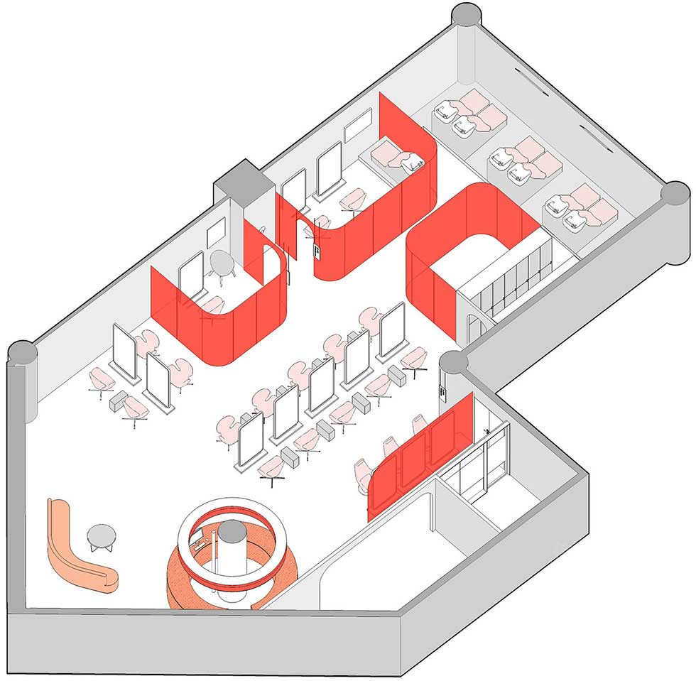 美發(fā)店外立面的裝修設(shè)計,采用水泥質(zhì)感的頂面和開放式落地玻璃的設(shè)計,室內(nèi)的景象在紅色玻璃的反射下,呈現(xiàn)出另一種沁人心脾的紅色經(jīng)典,打開人們的好奇心想要進(jìn)去一探究竟。