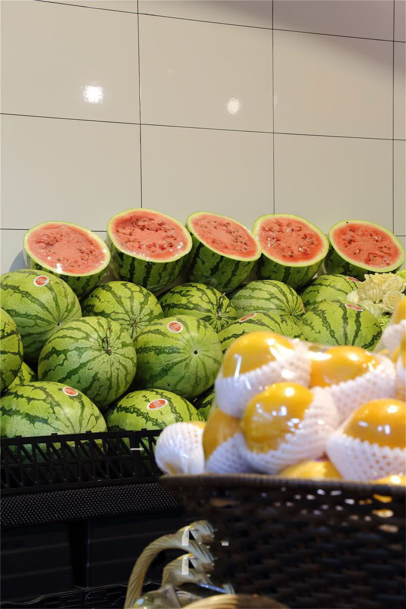 原結構的頂面噴黑處理,摒棄了復雜的設計方式,注重其經濟,環(huán)保,實用價值,白色文化石磚墻,各種新鮮水果的中島臺和保鮮柜,保證店里的水果一直新鮮和美味。