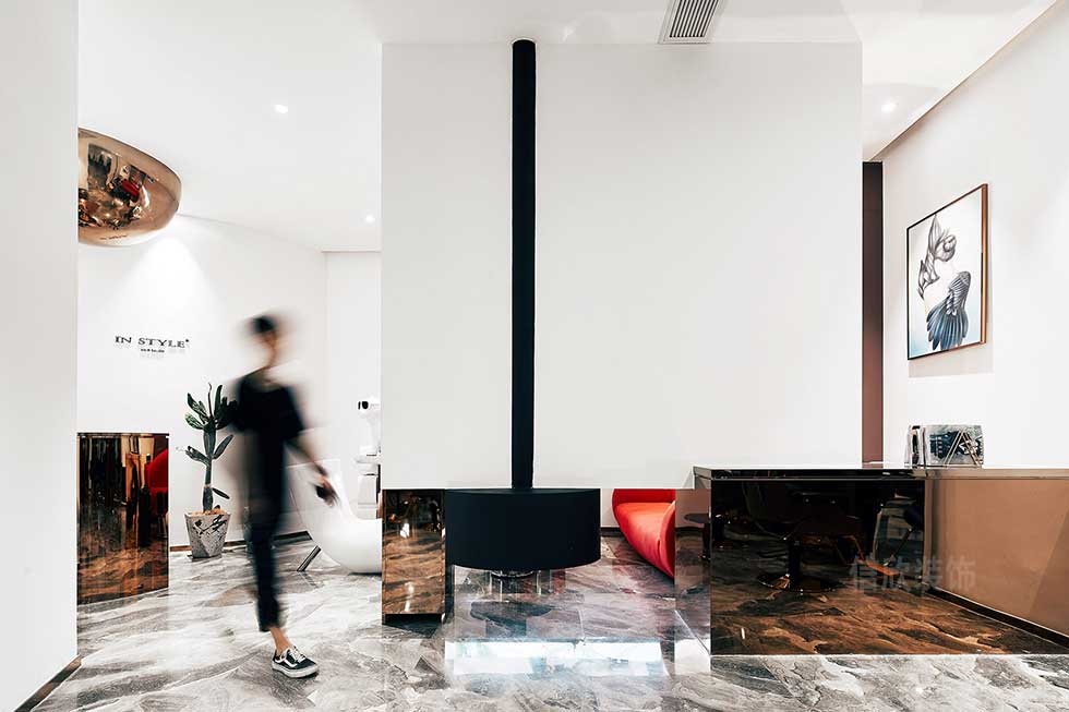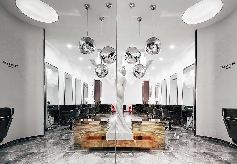 ▼理發(fā)區(qū)概覽,雕像裝置為美發(fā)空間注入靈動的藝術氣息